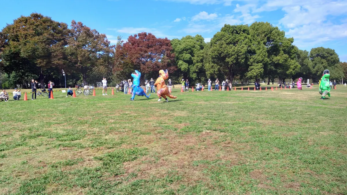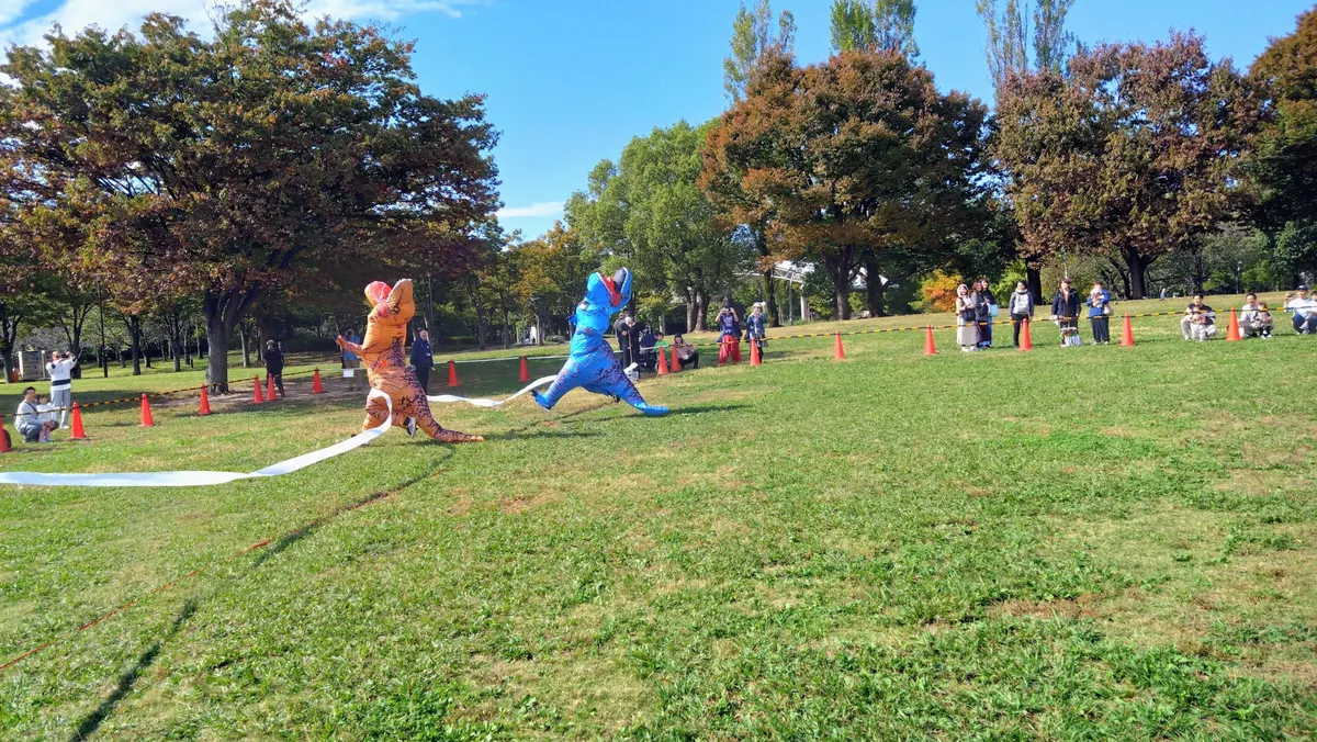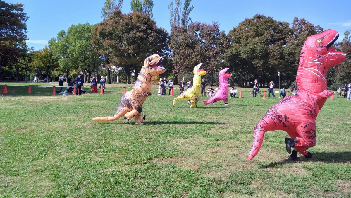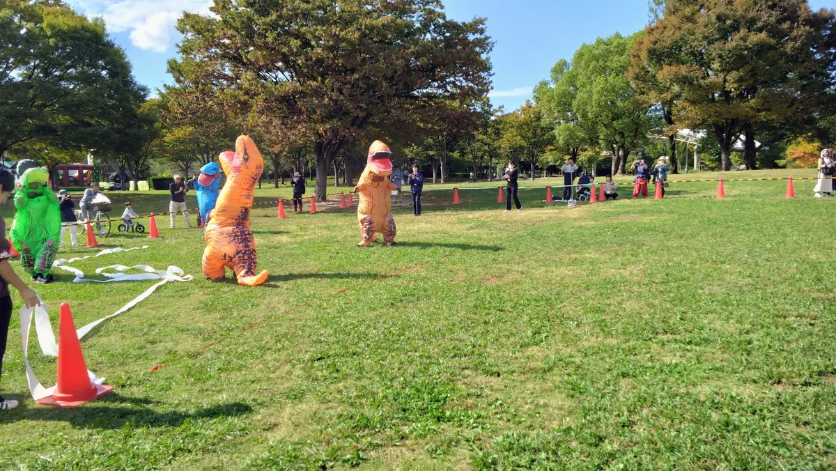 ▶ティラノサウルスの着ぐるみを着て走るという競技である。