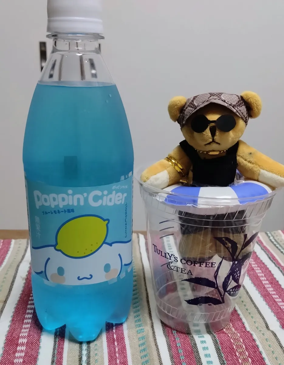 プールはダ○ソーで見つけた青いソーダと&TEAカップ