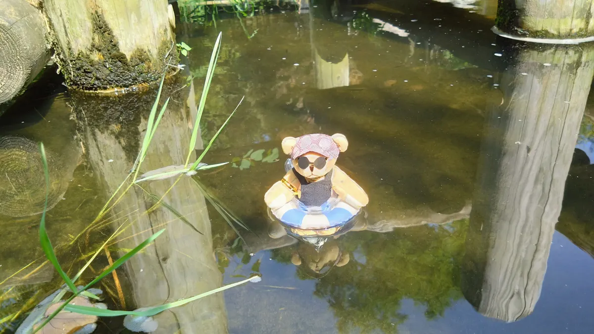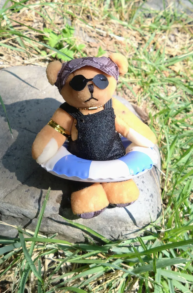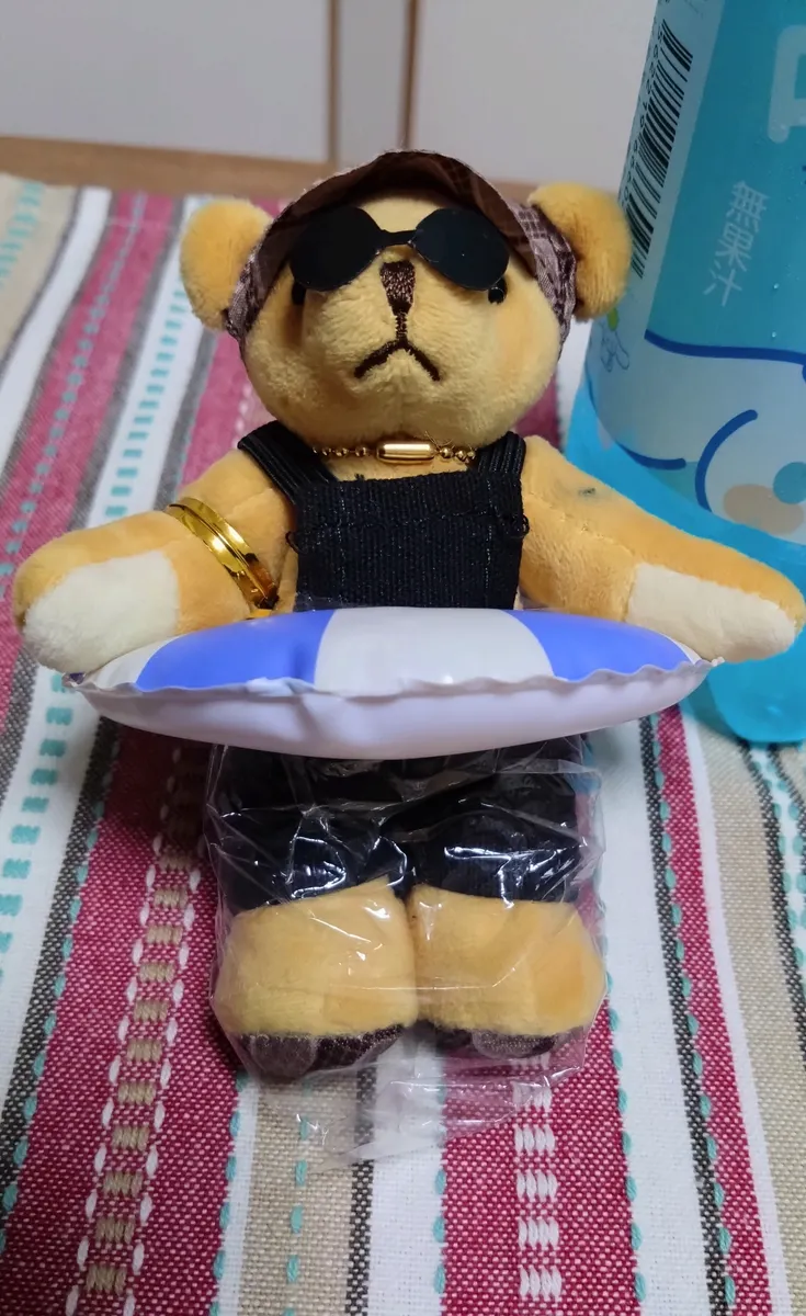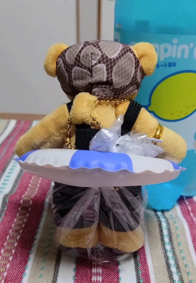 実際に水に浮かせようとするとこのサイズのぬいは軽くて浮き輪なしでも浮いてしまいます(恐らく濡れて全身に水がしみると沈んでしまうと思います)。
