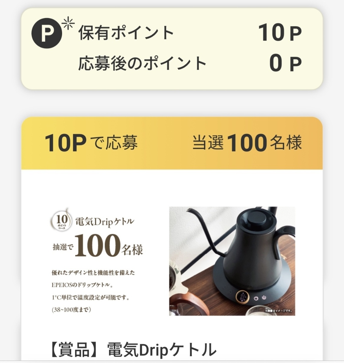 ケトルへの応募は25日まで。高ポイントを稼げるコーヒーがどこにも売ってないので、この一回で諦めます😅