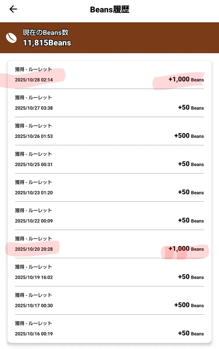 トップ > なんでも写真館 > え!ひと月に2回! にゃにゃ 2025/10/28 02:19 え!ひと月に2回! 今月は1度、1,000Beans当たったので もう当たらないだろうと思っていたら まさかの2回目当たりました! 夏からなかなか ひと月に1度も1,000Beans当たらなくなっていたので 驚きましたが、とても嬉しいです。 この前、 15,000Beans使ってチケットをもらってしまったので 今また一生懸命に貯めているところです。 貯まるのが楽しみです。 ルーレット 1000Beans いいね 共有する 共有する X facebook LINE リンクをコピー コメントする 4 件の返信 (新着順) ミュートしたユーザーの投稿です。 投稿を表示 Yysasaki 2025/10/28 15:20 Congratulations 🩷 おめでとうございます🎁 🎯 僕は日頃の行いが祟って 1ポイントでした。 危ない投稿は避けて居る つもりですが たまにやって仕舞います。 いいね 返信する ミュートしたユーザーの投稿です。 投稿を表示 penguinlovescoffee 2025/10/28 13:02 おめでとうございます♪ まだ今月も数日ありますからぜひ3回目を当ててください🎯 いいね 返信する ミュートしたユーザーの投稿です。 投稿を表示 みきたそ。 2025/10/28 08:45 おは&おめで㌧ございます👏 やっぱり1000豆はアガりますよねー。 私はタリれずに豆の在庫過多です笑 いいね 返信する ミュートしたユーザーの投稿です。 投稿を表示 matusko 2025/10/28 07:49 おめでとうございます㊗️🎉✨ 良かったですね~ 私は今月まだ出てません💦 残り3日内に2度出てくれたらと思ってます🙏 それでも15000まで5358ポイント足りないですが、、、😓 いいね 返信する