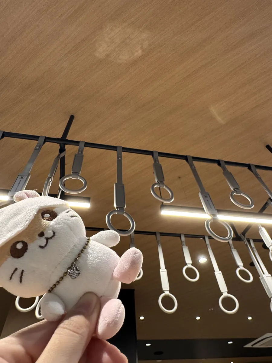 投稿を表示めちゃでかベアフルさんはやっぱり上をみちゃいますね🤭赤いエプロンがお似合いです🧸 なぜ吊り革?