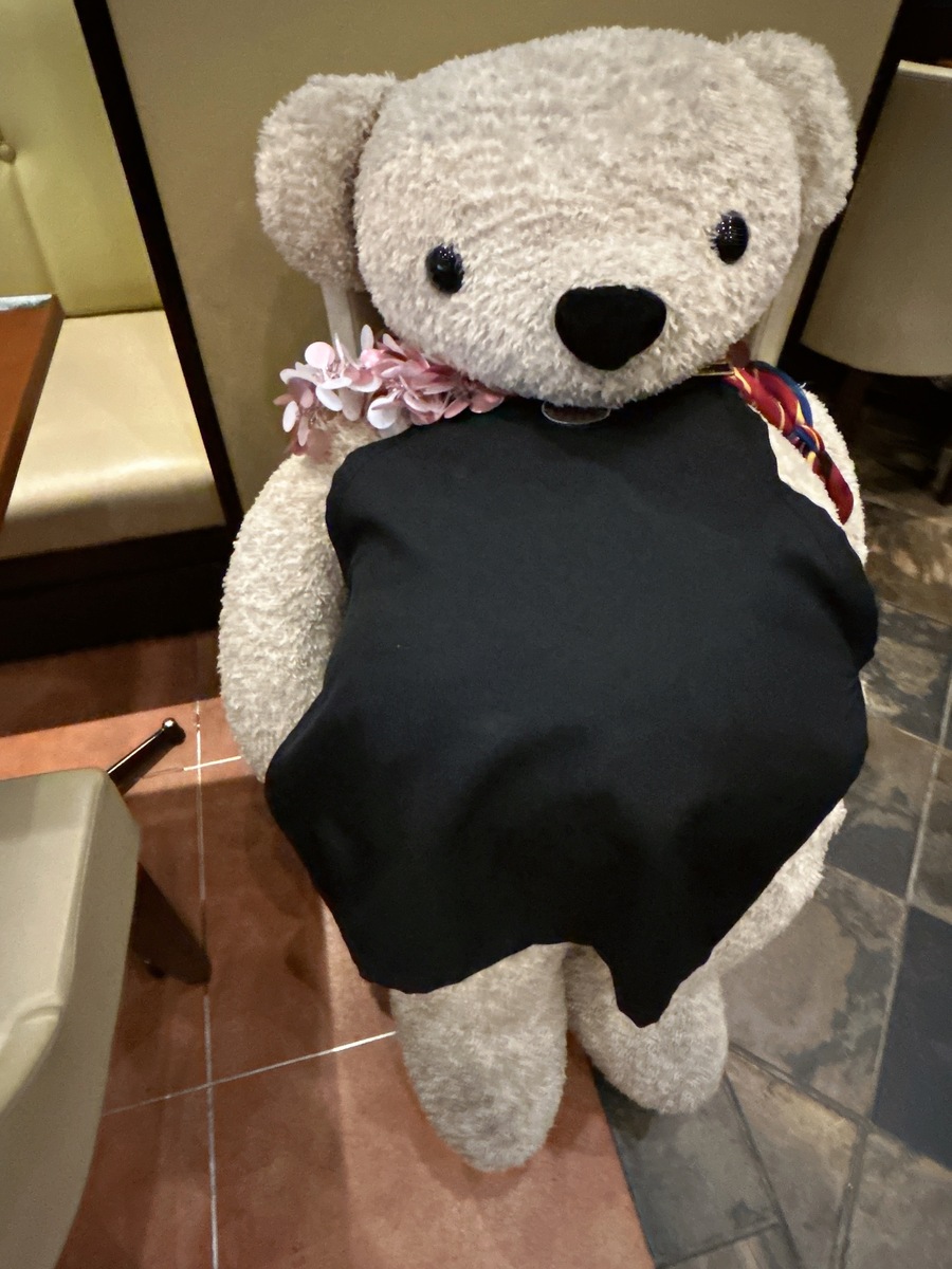 店内の席の脇にとっても大きなベアフルが、朝に座ってお出迎え🥰