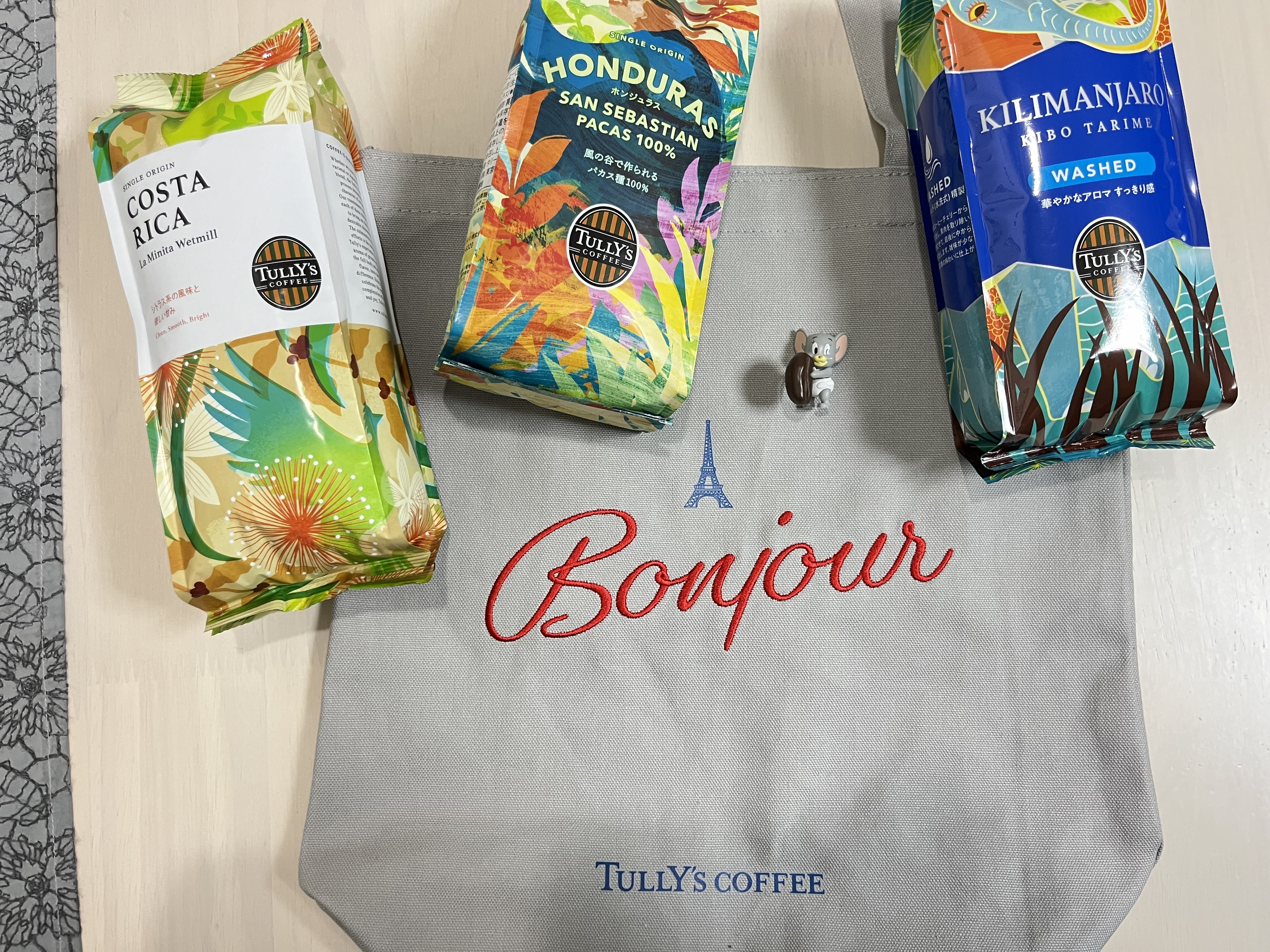 投稿を表示グレーのバッグに溶け込んだジェリーがお豆さんを持っているのがコーヒー豆袋と合っていい感じです