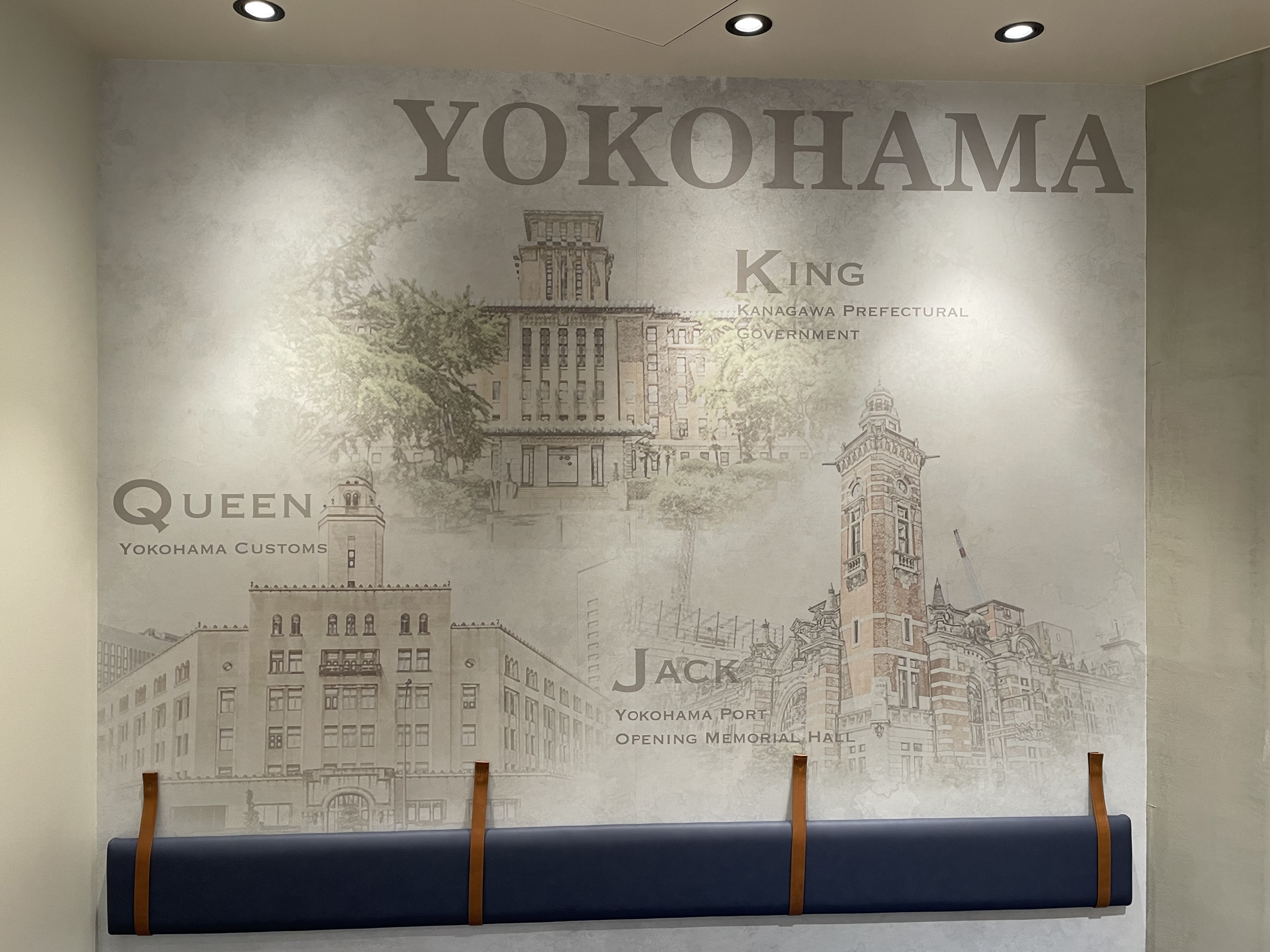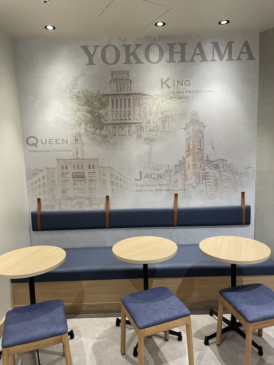 ↑そして1番の注目は、入って正面奥の壁に描かれた横浜三塔‼️横浜を象徴する歴史的建造物なのです✨胸アツポイントです🤩(三塔がある場所は、日本大通り店の近くなんですけどね)