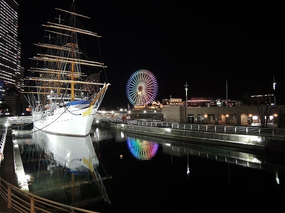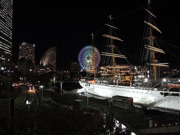 明るくライトアップされた日本丸の隣にレインボー観覧車🛳️🎡🌈