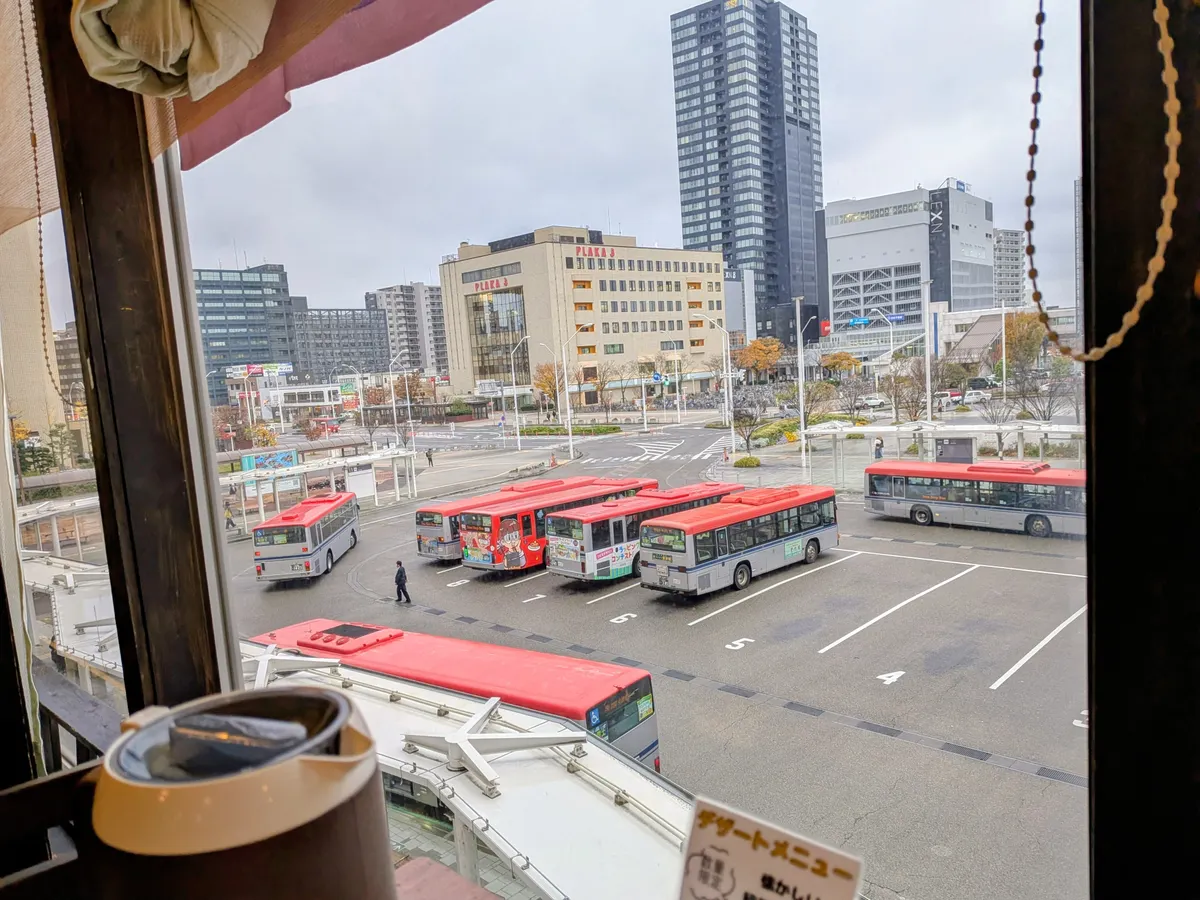 いつもの〈握り飯と山のけんちん汁〉を頼んで窓際の席に座ってバスが弧を描く様に次々と発車して行くのを見てるのが好きです♪