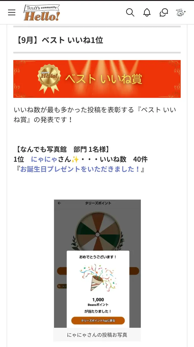 「お知らせ」のページから「9月 ベストいいね賞!」のカテゴリーを選ぶと、どの投稿で受賞したのか分かりますよ😊