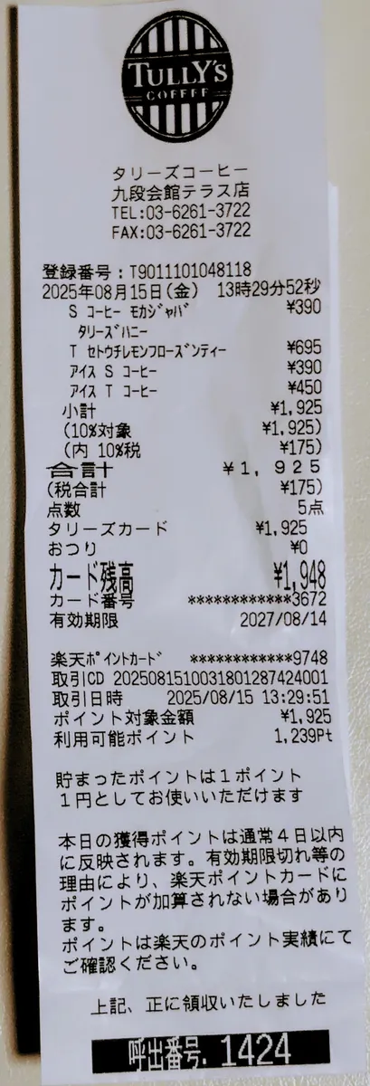 ご褒美のタリーズ九段会館テラス店へ5人で。
