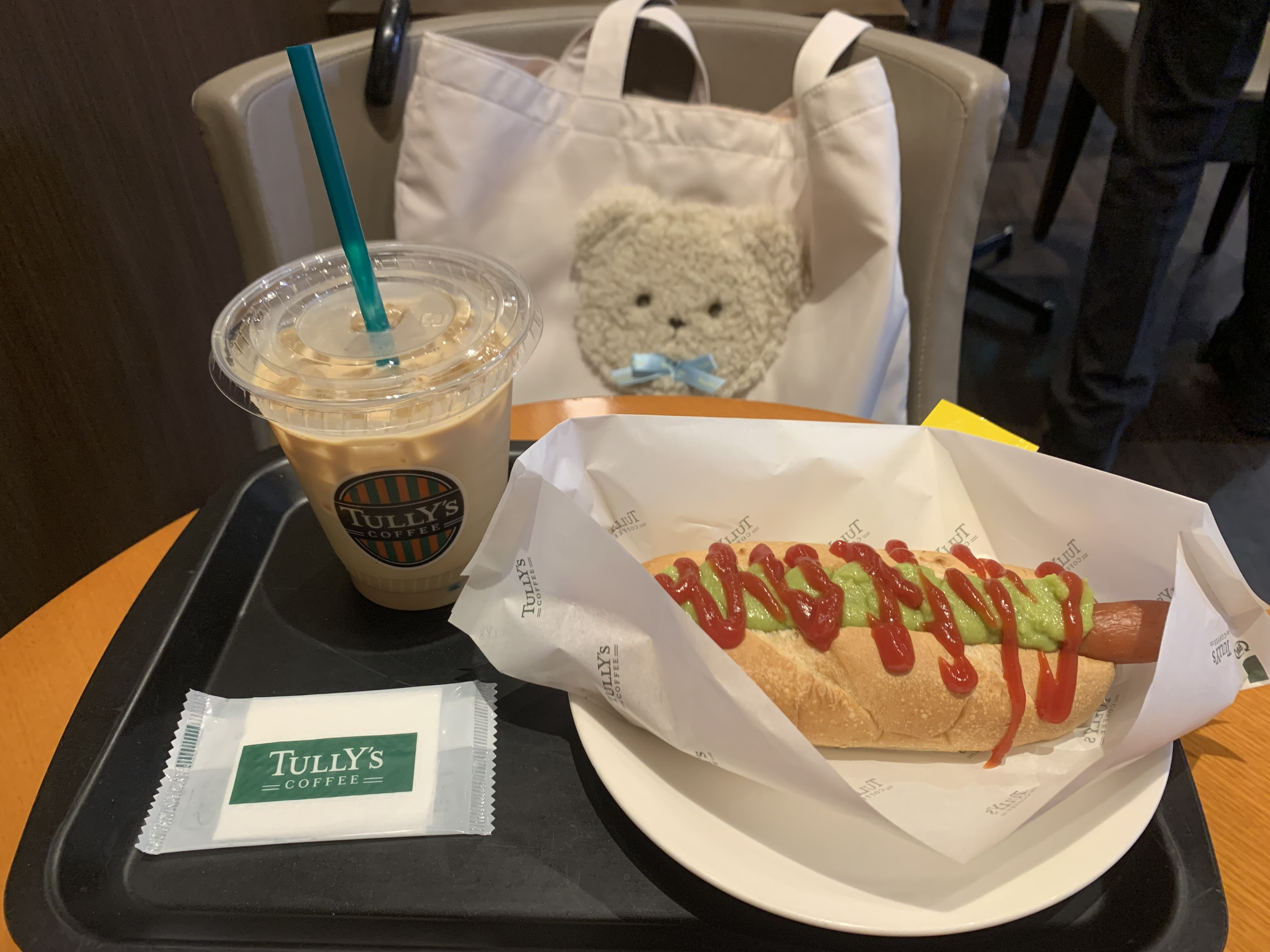 テンションを上げていくために今日もタリーズへ!!今日はカフェラテのヘーゼルシロップ追加とホットドックのアボカドにしました🥑