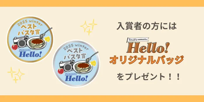 受賞者の方には、『TULLY'S community Hello!』オリジナルバッジをプレゼントさせていただきました。受賞バッジは、マイページの保有バッジからご確認してみてください♪