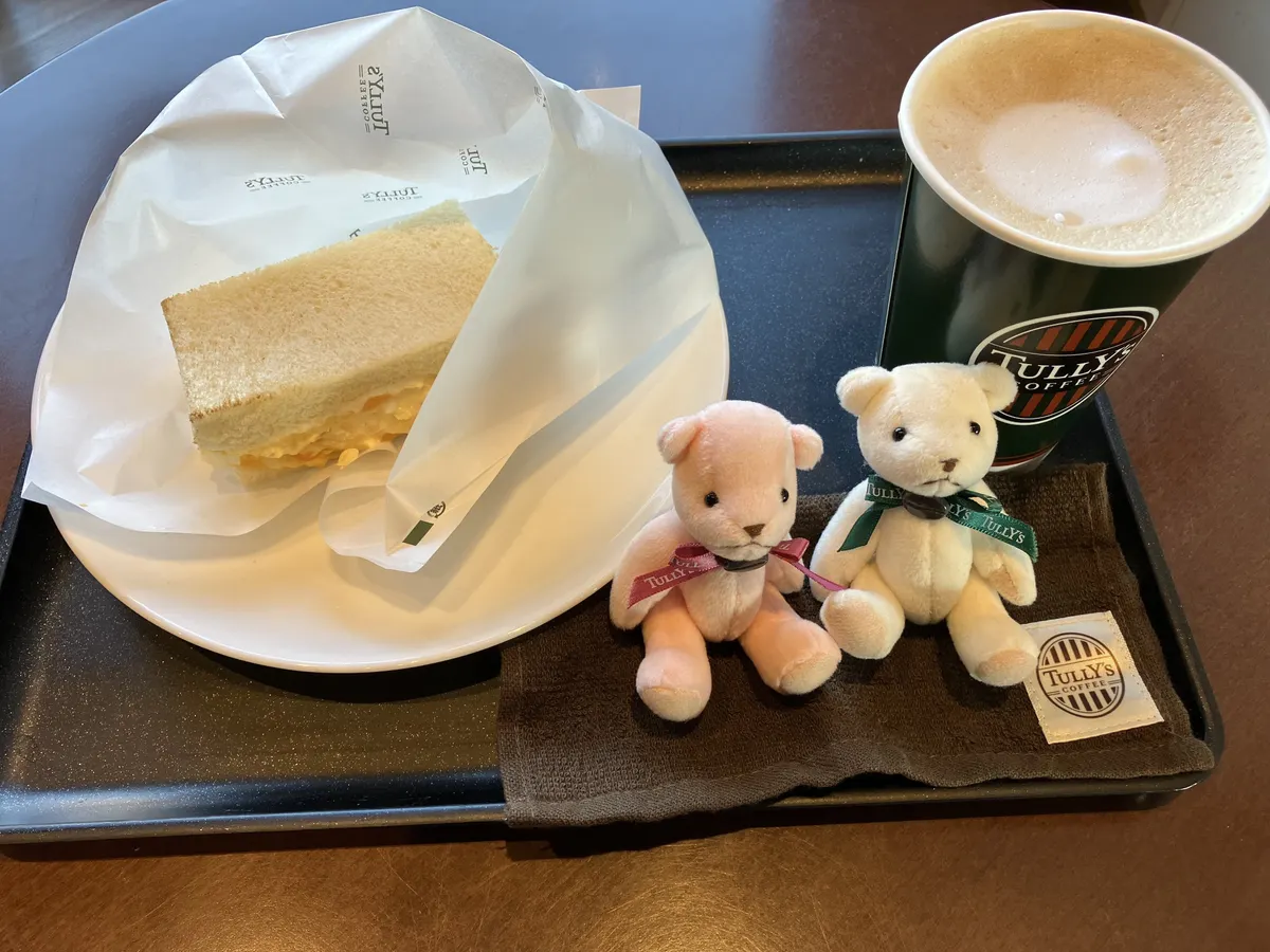 タリーズのカフェラテ、美味しいですよね😌 少しヒーティングされたたまごサンドとのペアリング良いですね✨
