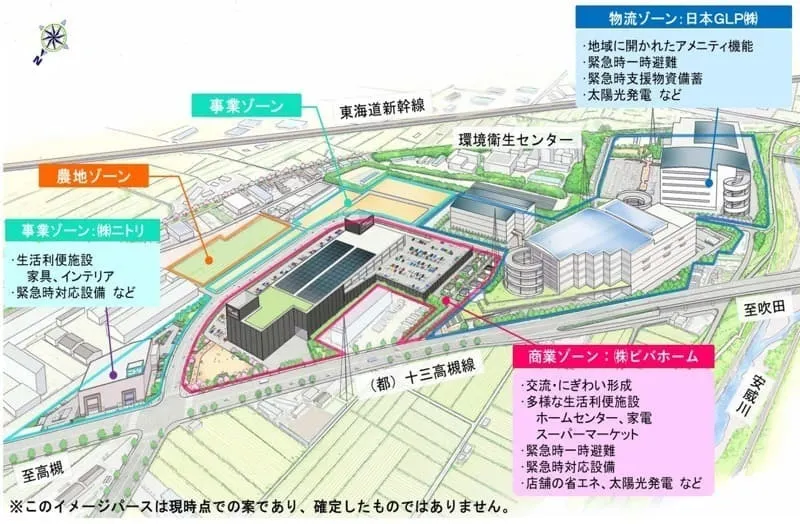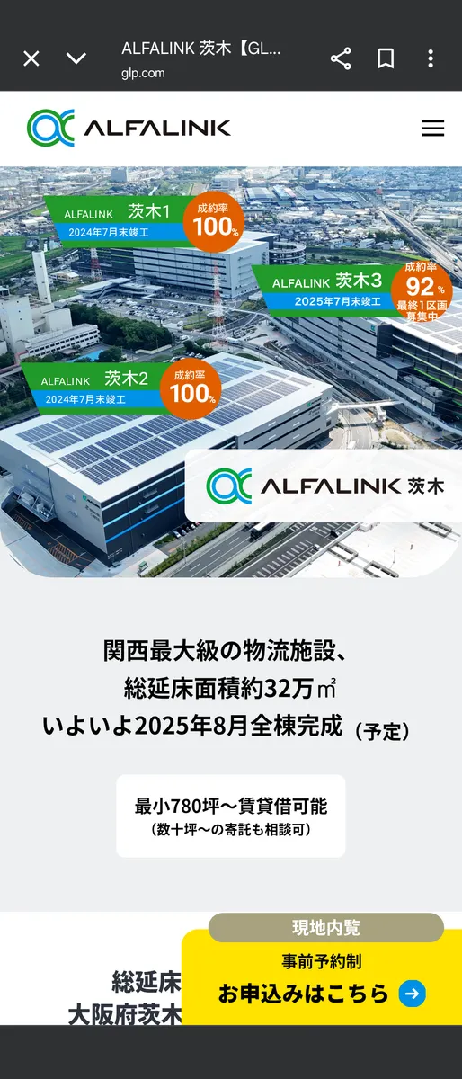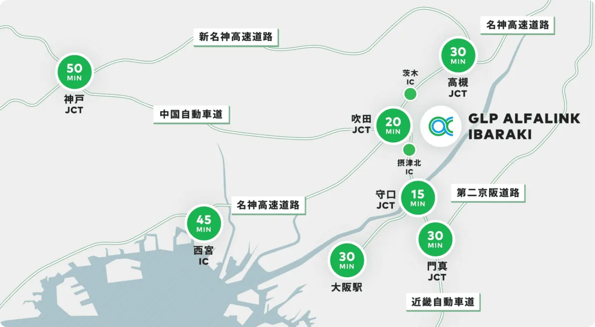 茨木市南目垣·東野々宮地区における28.2haに及ぶ大規模な区画整理事業の結果、『イコクル茨木』と名付けられた新しい街の物流ゾーンにオープンした総延床面積32万㎡という西日本最大級の物流施設『アルファリンク(ALFA LINK)茨木』。