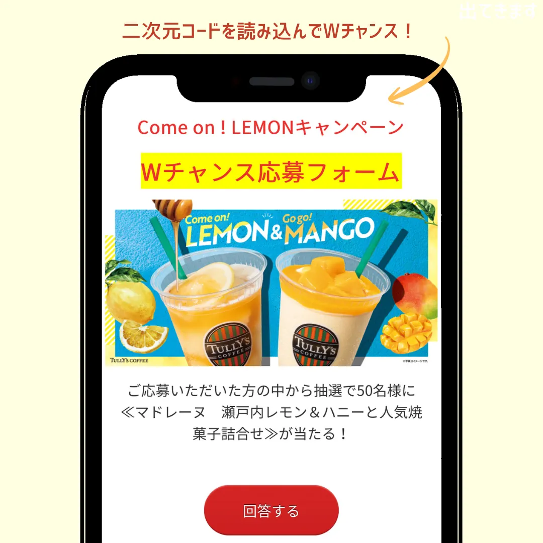 対象商品を購入したレシート下部の二次元コードより『Come on ! LEMON Wチャンスキャンペーン』にご応募いただけます。