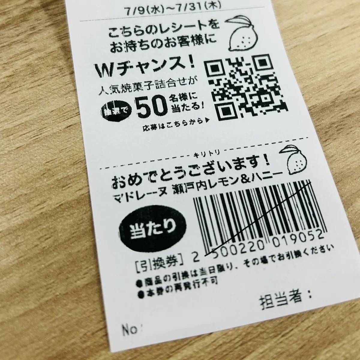 あたりがでた方は、当日中にレシートを購入店舗のフェローへご提示いただけると、その場で「マドレーヌ 瀬戸内レモン&ハニー」をプレゼント!🥳🥳