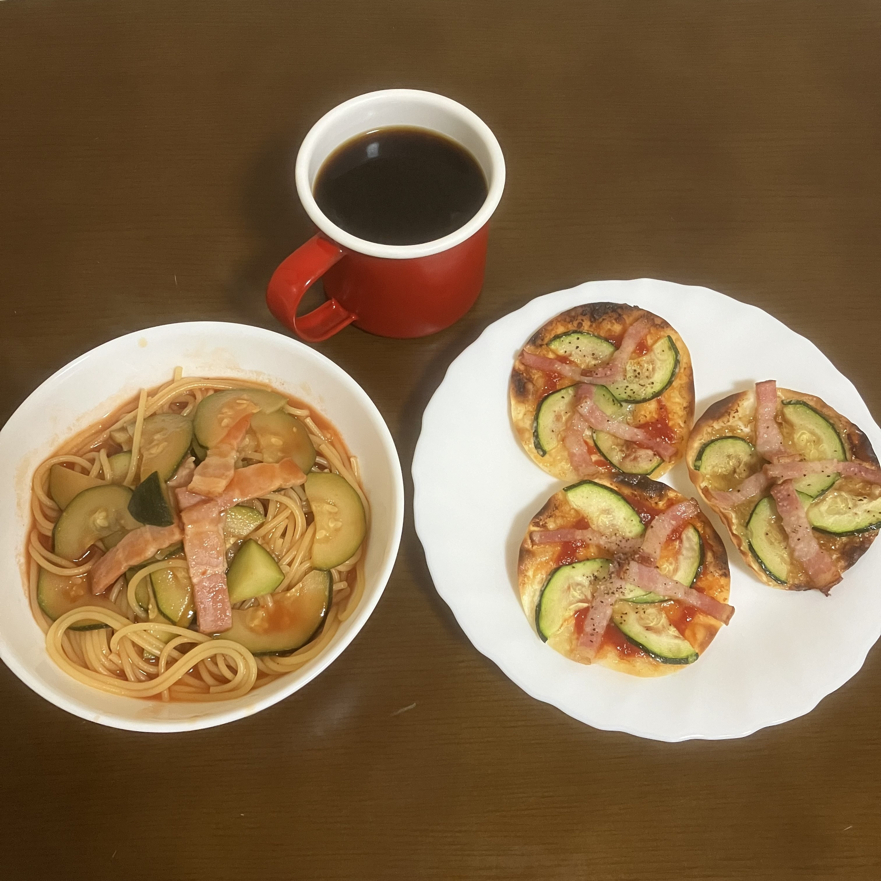 ズッキーニとベーコンにトマトスープパスタは黄金の組み合わせに一味唐辛子がアクセントできっと美味しいに決まっていますね