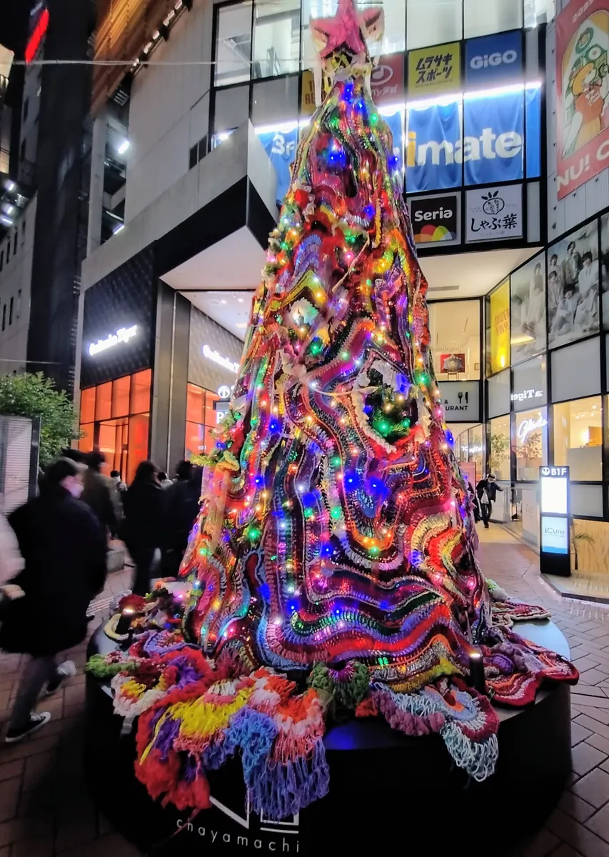 雑誌や映像·アーティストの衣装など多方面で活躍しているニットアーティストの蓮沼千紘氏が手掛ける「ニットを着たクリスマスツリー」。
