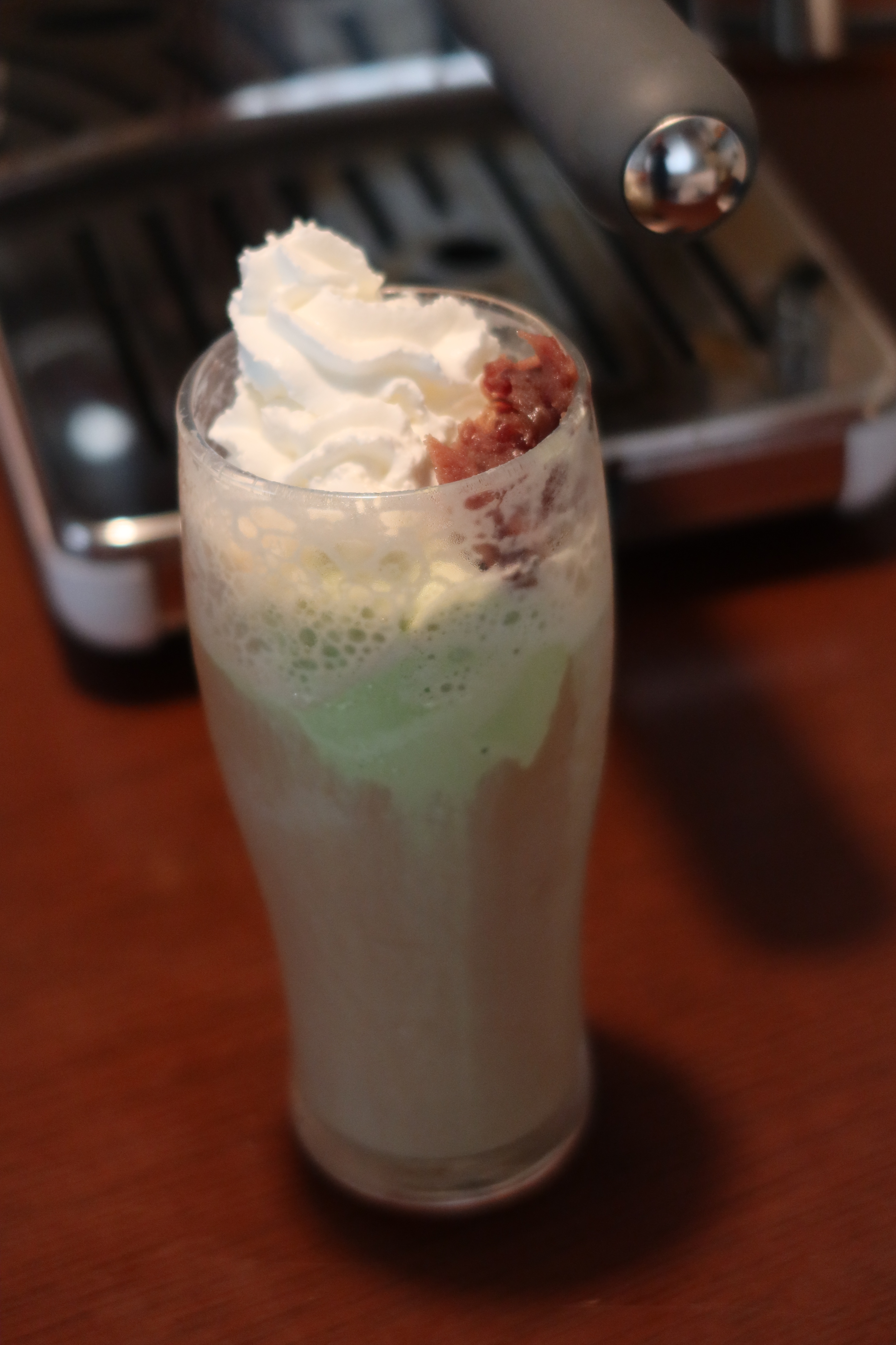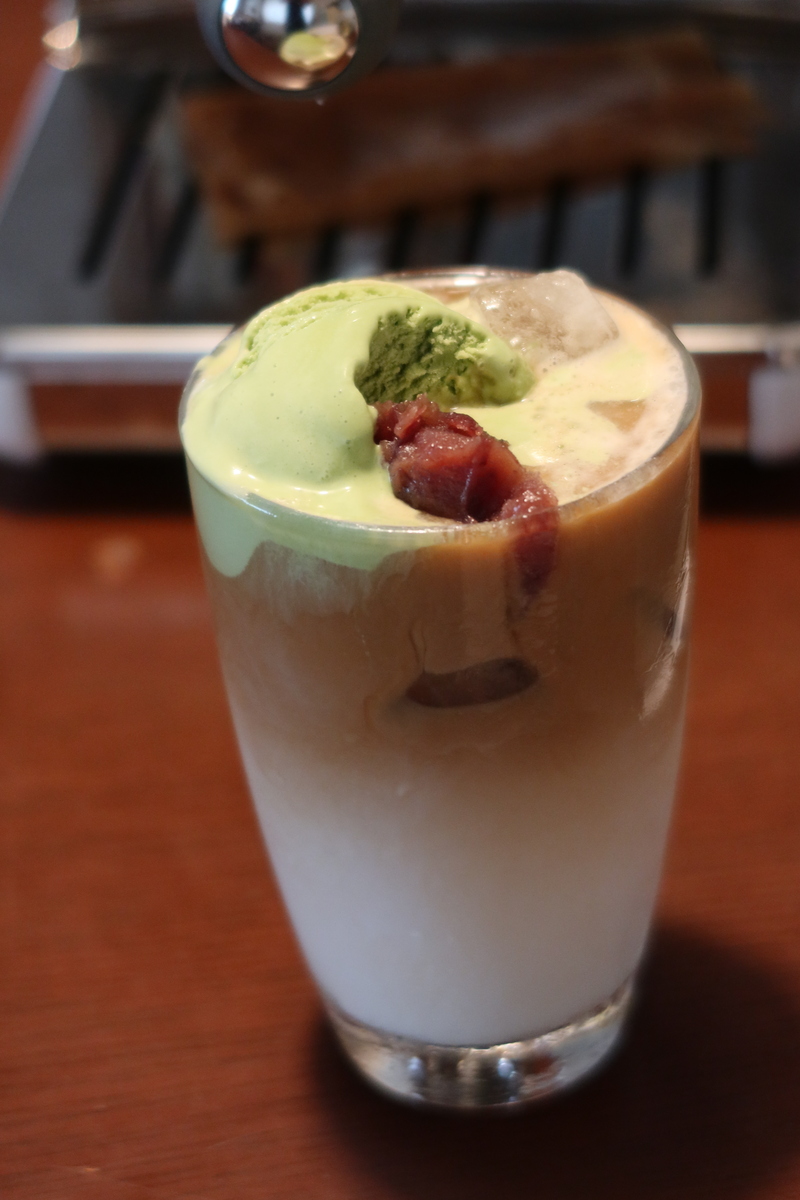 クラッシュアイスにシェイクしたミルクを混ぜて上からエスプレッソWをリストレットしたものをかけて抹茶のアイスと小豆を乗せましたが沈みました。ホイップがかろうじて残るさまで失敗