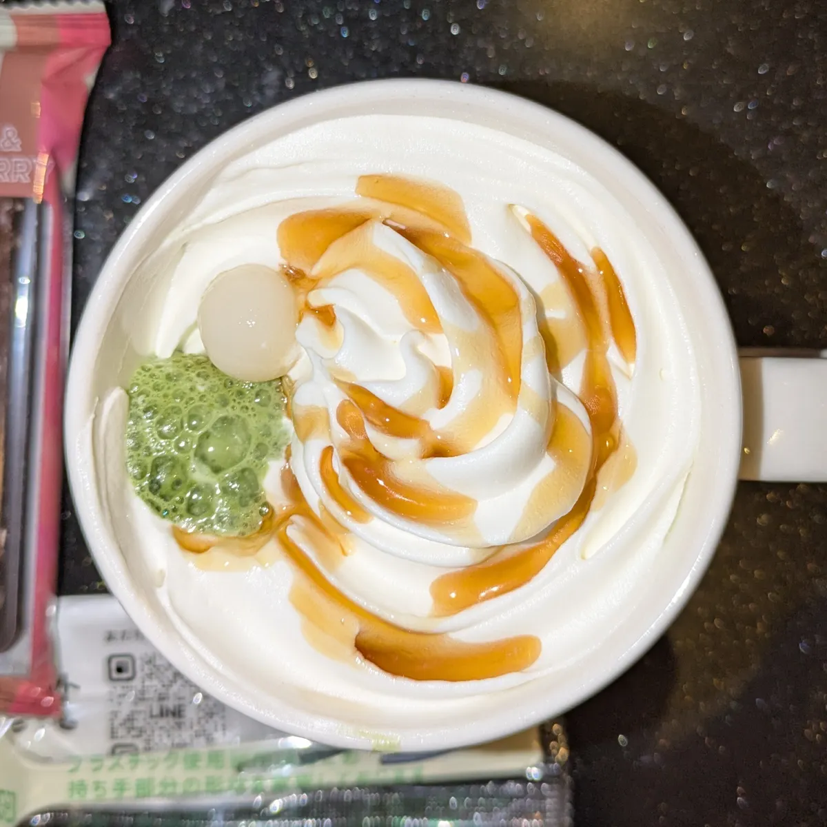 噂通り、ホットだと?団子があっという間に沈んでいきます…かろうじて写真では1つだけ残っていますが、3つありました 飲んでから思いましたが、団子増量できたのかな? みたらし団子と抹茶の和のコラボ 甘じょっぱい抹茶ラテが斬新ですが合いますね 抹茶塩とかあるし、もともと塩味も合うんですね 美味しかったです😍