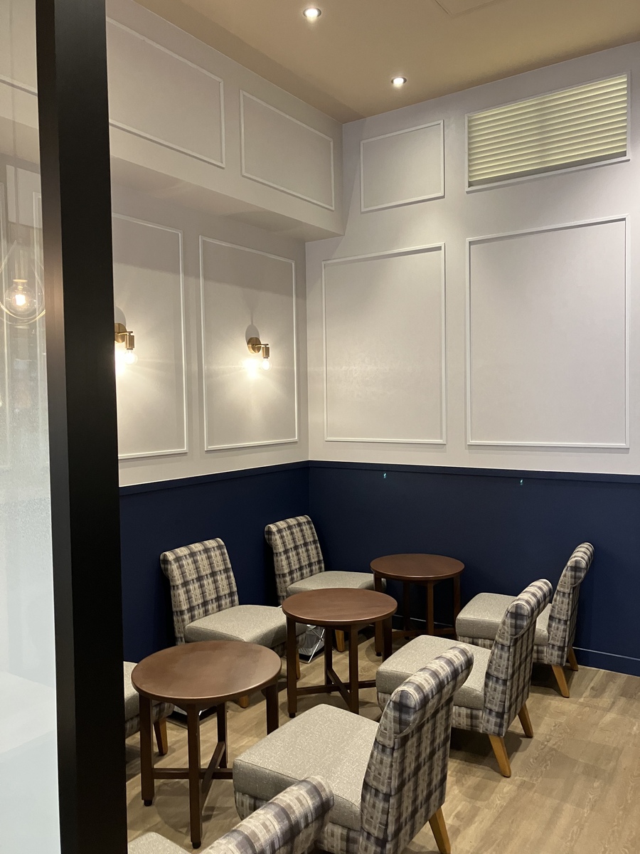 投稿を表示&TEAさんのネイビーと白の内装、綺麗ですね、チェックの椅子も可愛いです✨