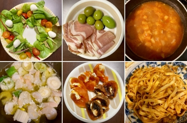 左上から、リース風サラダ、生ハムとオリーブ、ミネストローネスープ、エビと下仁田葱のアヒージョ、干し柿のクリームチーズ巻き、ボロネーゼフェットチーネ