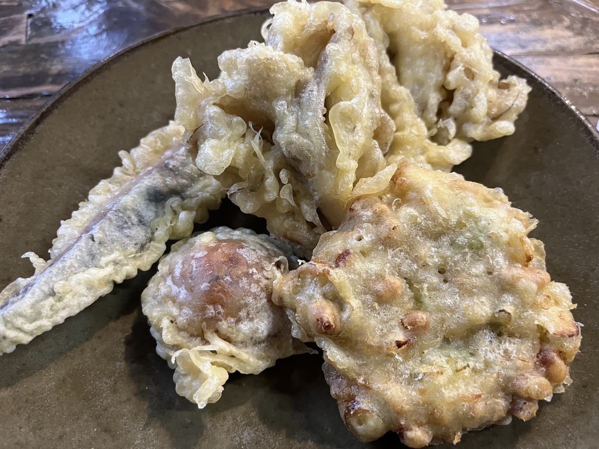 名物の天ぷらは、にしん、まんじゅう、納豆、舞茸を注文