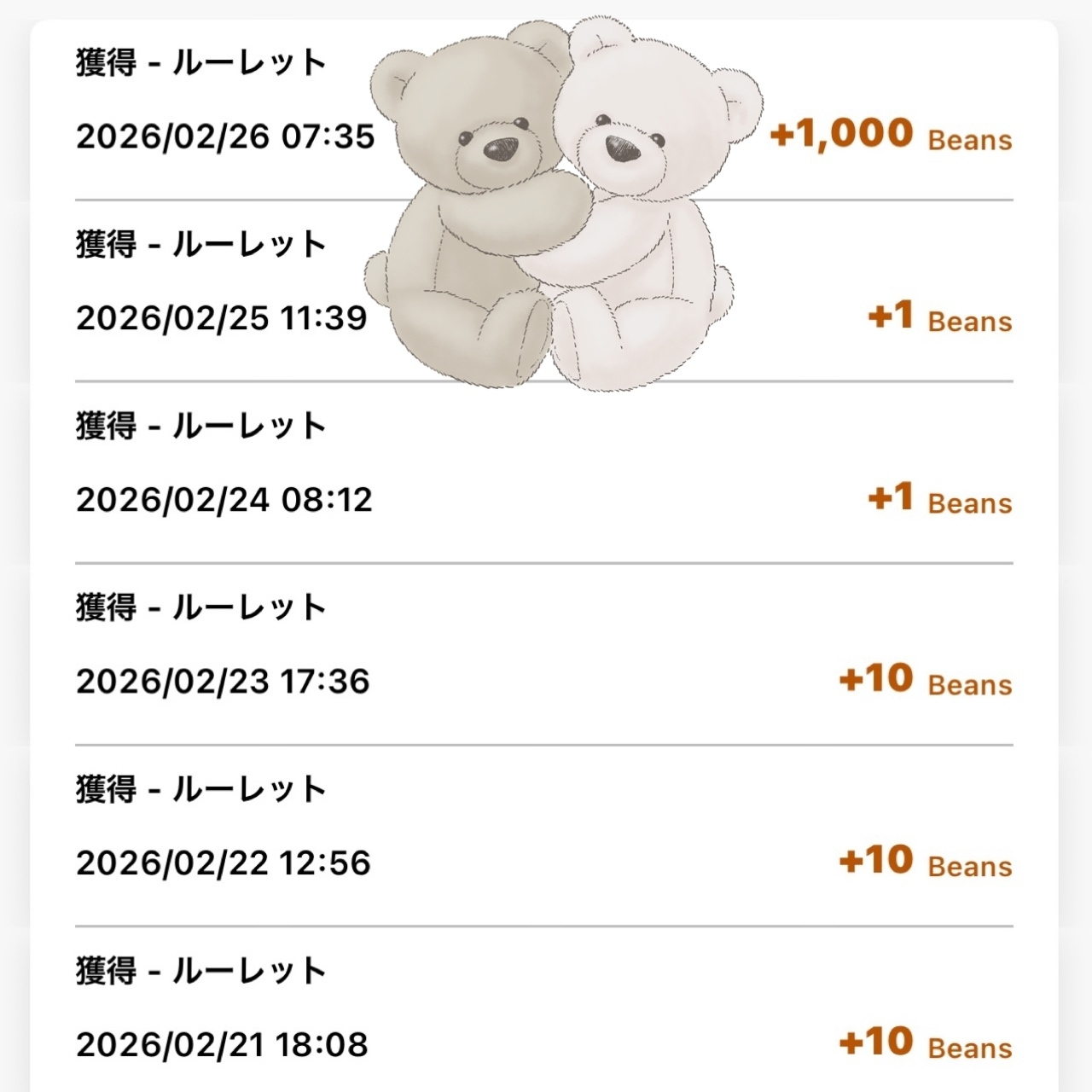 トップ > なんでも写真館 > ヾ(*ΦωΦ)ノ ヒャッホゥ! 黒みつ 2026/02/26 16:13 ヾ(*ΦωΦ)ノ ヒャッホゥ! 2月に入ってからずーーーっと ほぼ1か10しか出ないという 悪夢のようなルーレットでしたが 本日やっと!! ✨️1,000Beans🫘✨️ (ง°̀ロ°́)ง💛キター!!✨ 長かったぜ⋯( ´ー`)フゥ ビーンズルーレット 大当たり いいね 共有する 共有する X facebook LINE リンクをコピー コメントする 5 件の返信 (新着順) ミュートしたユーザーの投稿です。 投稿を表示 👑🇳🇱🇧🇪🇱🇺💐でん六🌷 2026/02/28 16:30 1000🫘きましたね! ひゃっほーですよね🙂 いいね 返信する ミュートしたユーザーの投稿です。 投稿を表示 Yysasaki 2026/02/27 00:25 Congratulations 🩷 Have a nice day. 🎯 いいね 返信する ミュートしたユーザーの投稿です。 投稿を表示 黒みつ 2026/02/27 09:46 Yysasaki ありがとうございます😊 流石に毎日は出ないですねぇ笑 いいね 返信する ミュートしたユーザーの投稿です。 投稿を表示 あずき 2026/02/26 22:43 おめでとうございます✨ 私も明日はあやかりたいです🍀 いいね 返信する ミュートしたユーザーの投稿です。 投稿を表示 黒みつ 2026/02/27 09:45 あずき ありがとうございます😊 今日は100でした(´▽) ''' いいね 返信する ミュートしたユーザーの投稿です。 投稿を表示 ジャスミン 2026/02/26 21:02 1000ヒャッホゥ(๑•̀ㅁ•́ฅ✧ですね いいね 返信する ミュートしたユーザーの投稿です。 投稿を表示 黒みつ 2026/02/26 21:30 ジャスミン やっと出たのでヒャッハー!でした←あっ! ふなっしーの叫び声に変わっちゃった笑 いいね 返信する ミュートしたユーザーの投稿です。 投稿を表示 matusko 2026/02/26 20:49 あら、可愛い💞加工アプリですか? いいね 返信する ミュートしたユーザーの投稿です。 投稿を表示 黒みつ 2026/02/26 21:29 matusko LINEカメラアプリの無料スタンプです😊デザインが次々入れ替わるので、次はなかったりします😅 いいね 返信する