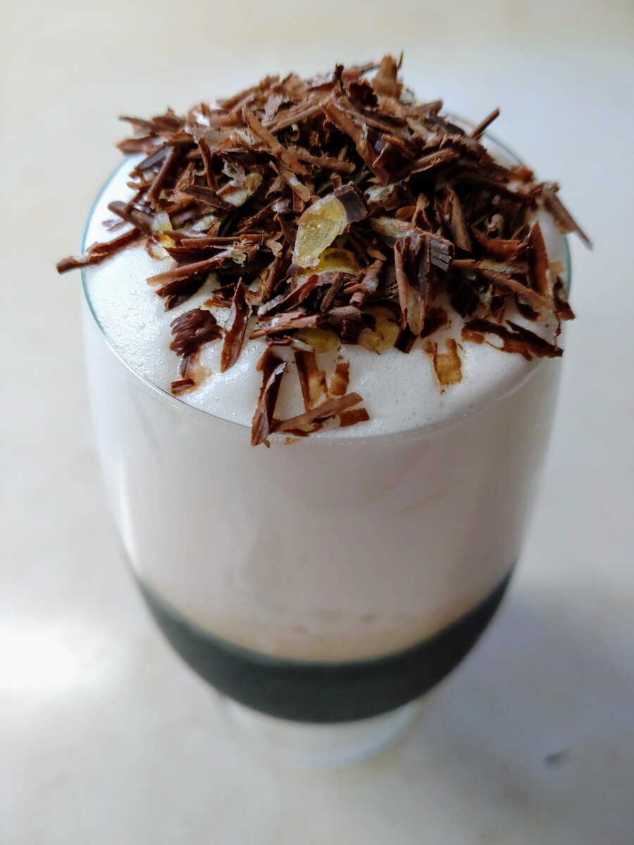 泡とチョコのミックスふわ甘でアクセントになるね♪チョコ削ったらそんなふうにおしゃれにくるっとなるかなぁ♪ココアパウダーよりそれがいいな✨