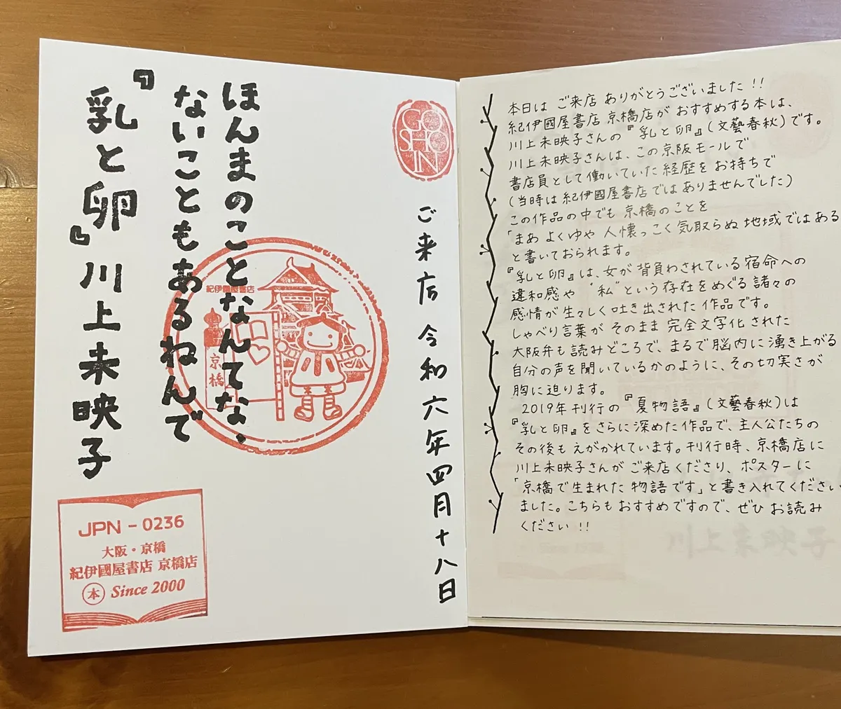 忙しい中、レジの店員さんがとても丁寧に話してくれました。いただいた紙には、川上さんは、この近くの出身で昔こちらの書店でバイトをしていた(←店員さん,めちゃめちゃ嬉しそうに話してくれました☺️)縁もあり、乳と卵を紹介させていただきますと書かれています。お話ししてくれた店員さんは本が好きというのが伝わってくる方で、とても感じの良い方でした。