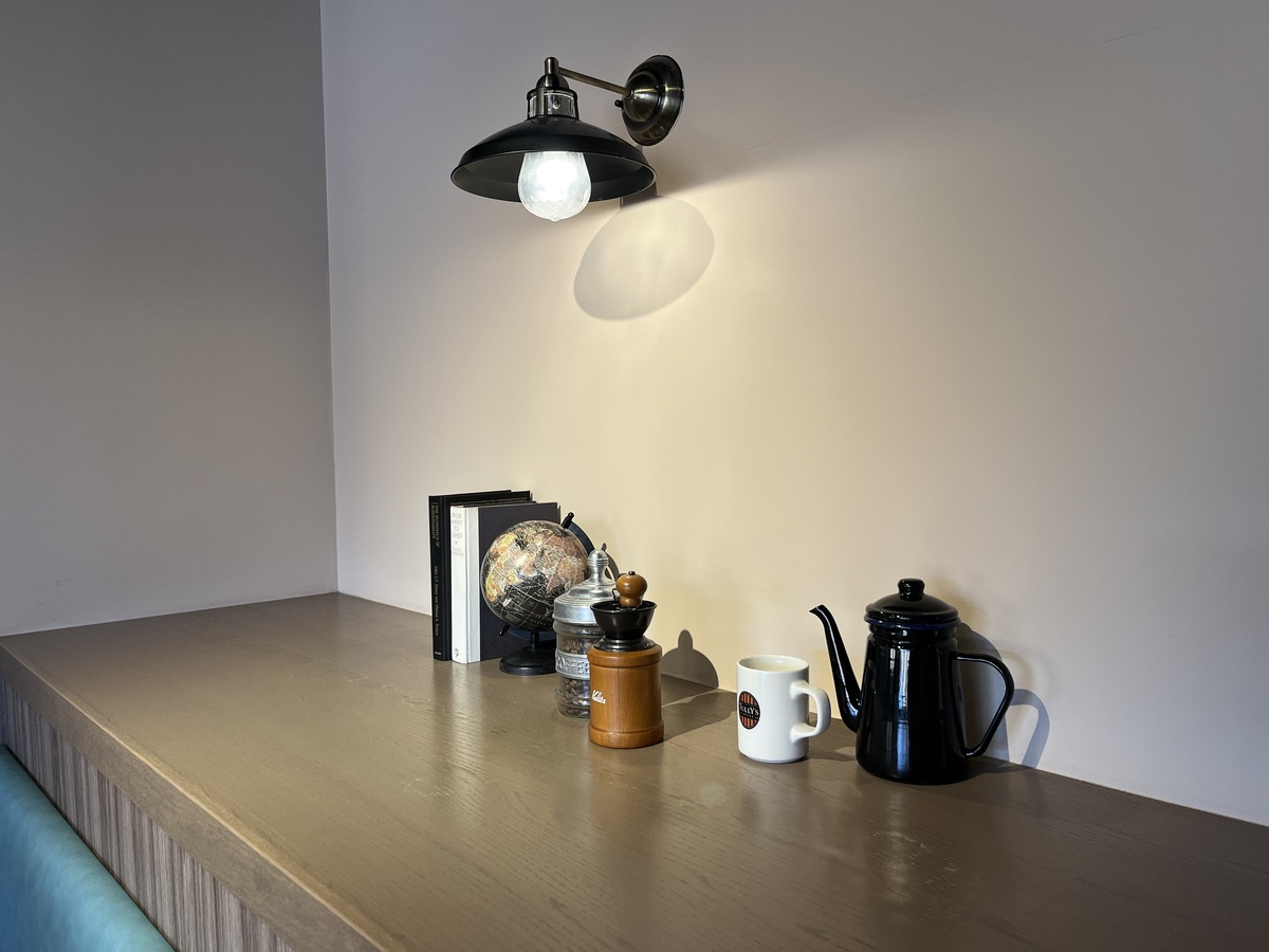 壁のロゴ、壁も、アンティークな雰囲気の小物たちもとってもオシャレですね😃✨✨