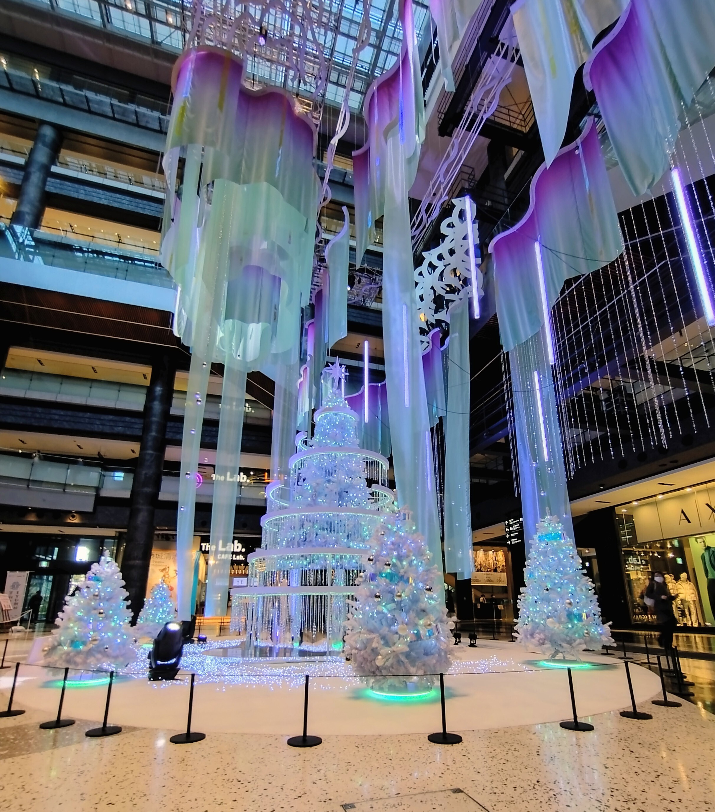 クリスタルガラスのツリーの頭上にオーロラをイメージした総長70mの光のベールが高さ11mから揺らめきます。