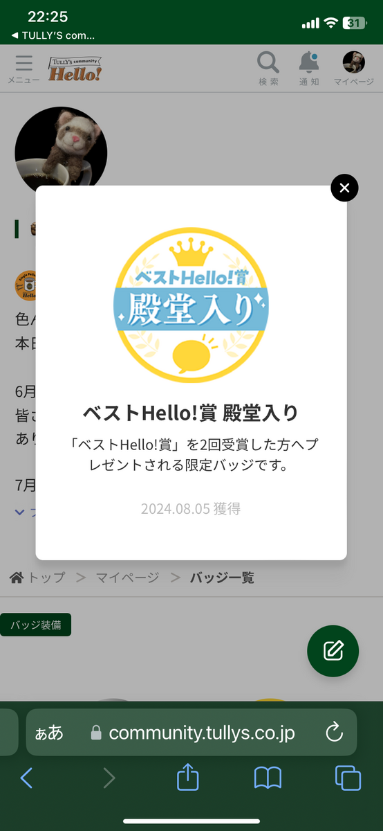トップ > なんでも写真館 > 日々の写真 > 7月ベストHello!賞 🦦らむちゃん 2024/08/10 22:42 7月ベストHello!賞 7月のベストHello!賞🏆 2度目ということで なんと、殿堂入りバッジ📛✨ いただきました( *˙ω˙*) ベストHello!賞は 心温かい皆さんが沢山 コミュニケーション取ってくれる おかげで取れた賞です🏆✨ 皆さんありがとうございます😊💕 これからもよろしくです😄💛✨ 早速バッジ取り替えました📛✨ いいね 共有する 共有する X facebook LINE リンクをコピー コメントする 5 件の返信 (新着順) ミュートしたユーザーの投稿です。 投稿を表示 ポイ 2024/08/11 14:01 ✨殿堂入り✨ 🧸💕 おめでとうございます👏🏻👏🏻👏🏻🤩 いいね 返信する ミュートしたユーザーの投稿です。 投稿を表示 🦦らむちゃん 2024/08/17 10:23 ポイ ポイさんありがとうございます🥰❤️✨ いいね 返信する ミュートしたユーザーの投稿です。 投稿を表示 ralikkuma 2024/08/11 10:58 おめでとうございます🎊🎉㊗️ カッコイイ👍 らむちゃんさんの努力が実を結びましたね。 私もバッジは4つありますがこれだけは持ってないので羨ましいです😍 いいね 返信する ミュートしたユーザーの投稿です。 投稿を表示 🦦らむちゃん 2024/08/17 10:31 ralikkuma ralikkumaさん、ありがとうございます🥰 忙しくなると中々ここにこれる時間が持てずもどかしいですが、来れるときに目一杯楽しんでralikkimaさんの後に続いてバッジ沢山手にいれていきたいです😊 いいね 返信する ミュートしたユーザーの投稿です。 投稿を表示 にゃにゃ 2024/08/11 08:14 おめでとうございます! 色んなバッヂがあるのですね! コンプリートできたら嬉しいですね! いいね 返信する ミュートしたユーザーの投稿です。 投稿を表示 🦦らむちゃん 2024/08/17 10:32 にゃにゃ にゃにゃさん、ありがとうございます🥰忙しくなると中々ここにこれる時間が持てずもどかしいですが、来れるときに目一杯楽しんでコンプリートしたいです😊 いいね 返信する ミュートしたユーザーの投稿です。 投稿を表示 ジーコ 2024/08/11 06:57 おめでとうございます!! いつも楽しい投稿ありがとうございます いいね 返信する ミュートしたユーザーの投稿です。 投稿を表示 🦦らむちゃん 2024/08/17 10:33 ジーコ ジーコさん、ありがとうございます🥰 忙しくなると中々ここにこれる時間が持てずもどかしいですが、来れるときに目一杯楽しもうと思ってます😄 いいね 返信する ミュートしたユーザーの投稿です。 投稿を表示 黒みつ 2024/08/10 22:55 おめでとうございます🎉 タリハロの ゆる〜く温かい世界観が心地いいですよね。 お時間のあるとき、よろしくお願いします☕️𓈒 𓂂𓏸 いいね 返信する ミュートしたユーザーの投稿です。 投稿を表示 🦦らむちゃん 2024/08/17 10:35 黒みつ 黒みつさん、ありがとうございます🥰 本当にこのゆるい温かい空間心地よいです😌大好きです❤️ 忙しくなると中々タリハロにこれる時間が持てずもどかしいですが、来れるときに目一杯楽しもうと思います😄 いいね 返信する