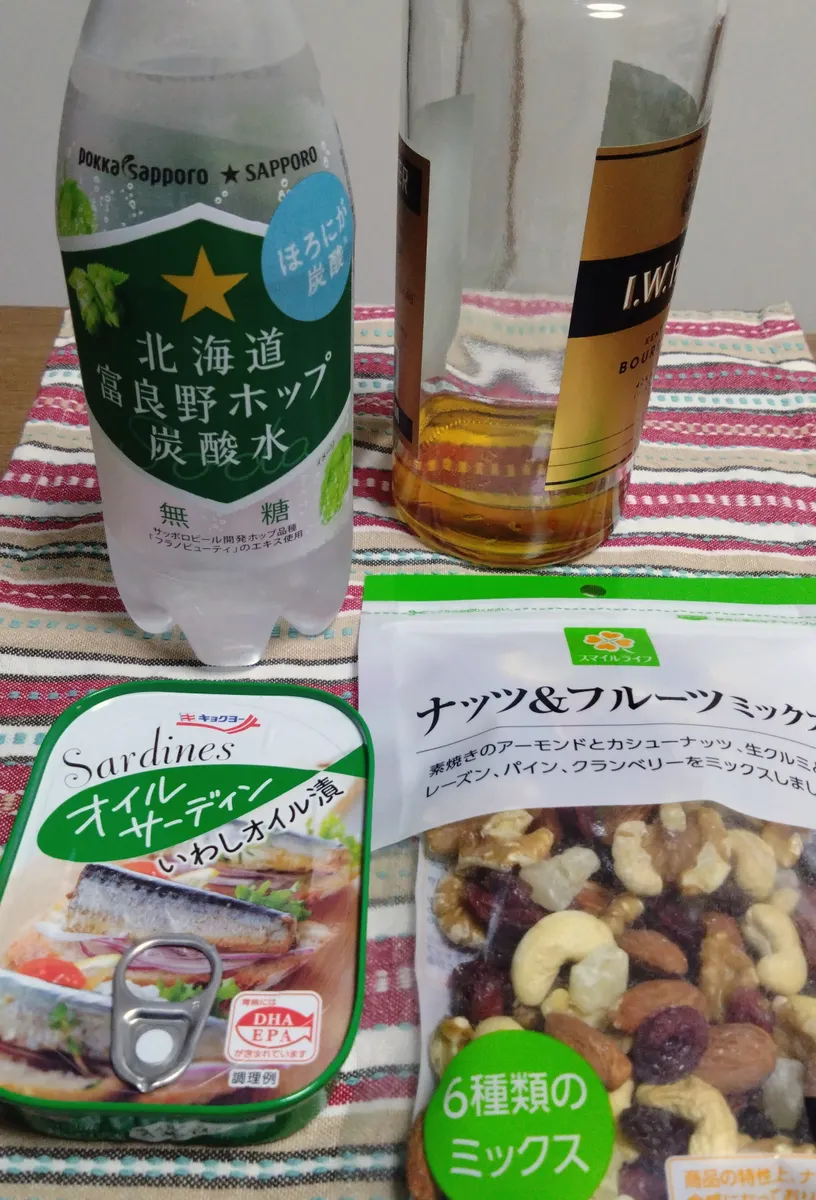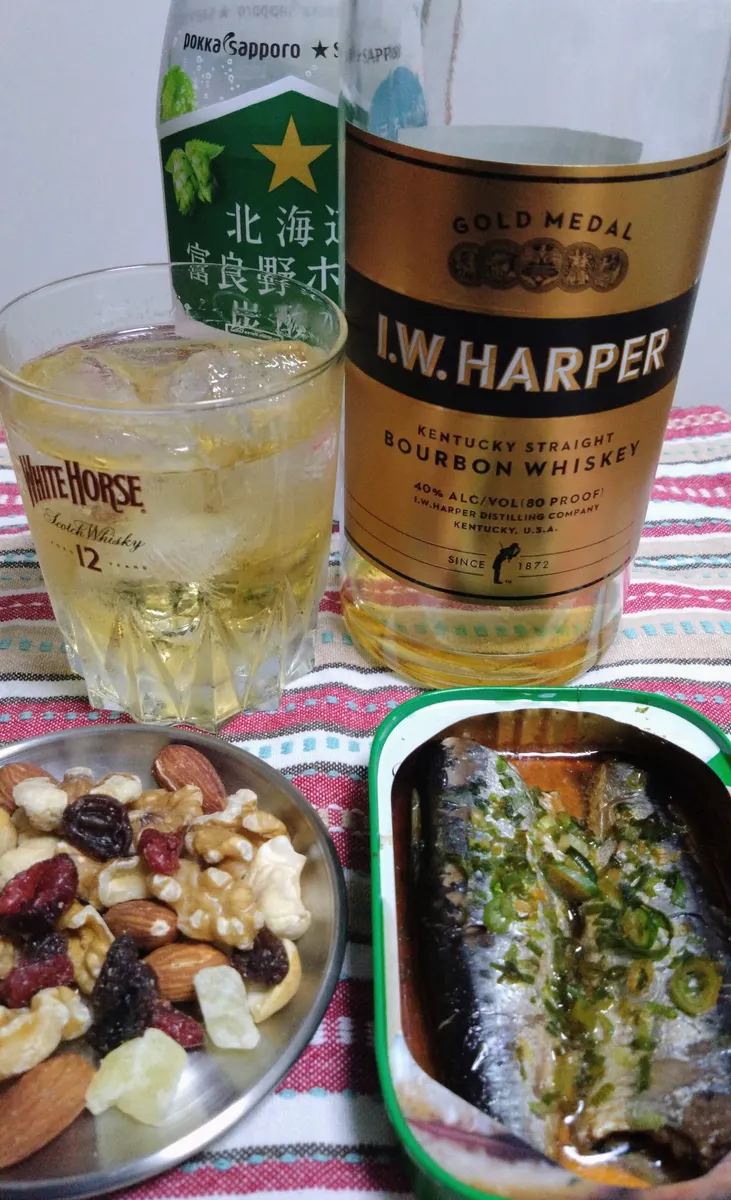 オイルサーディンの醤油焼きとナッツとドライフルーツを肴にI.W.ハーパーのハイボールで晩酌。