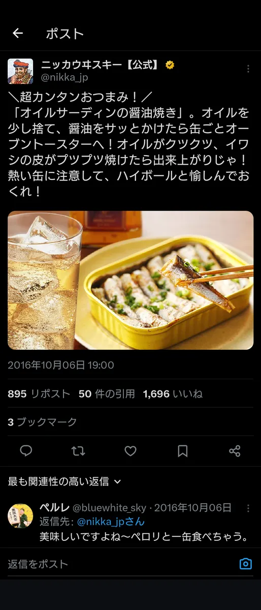 某ウイスキー公式もオススメ『オイルサーディンの醤油焼き』(醤油ではなく粗挽きペッパーでも可)。