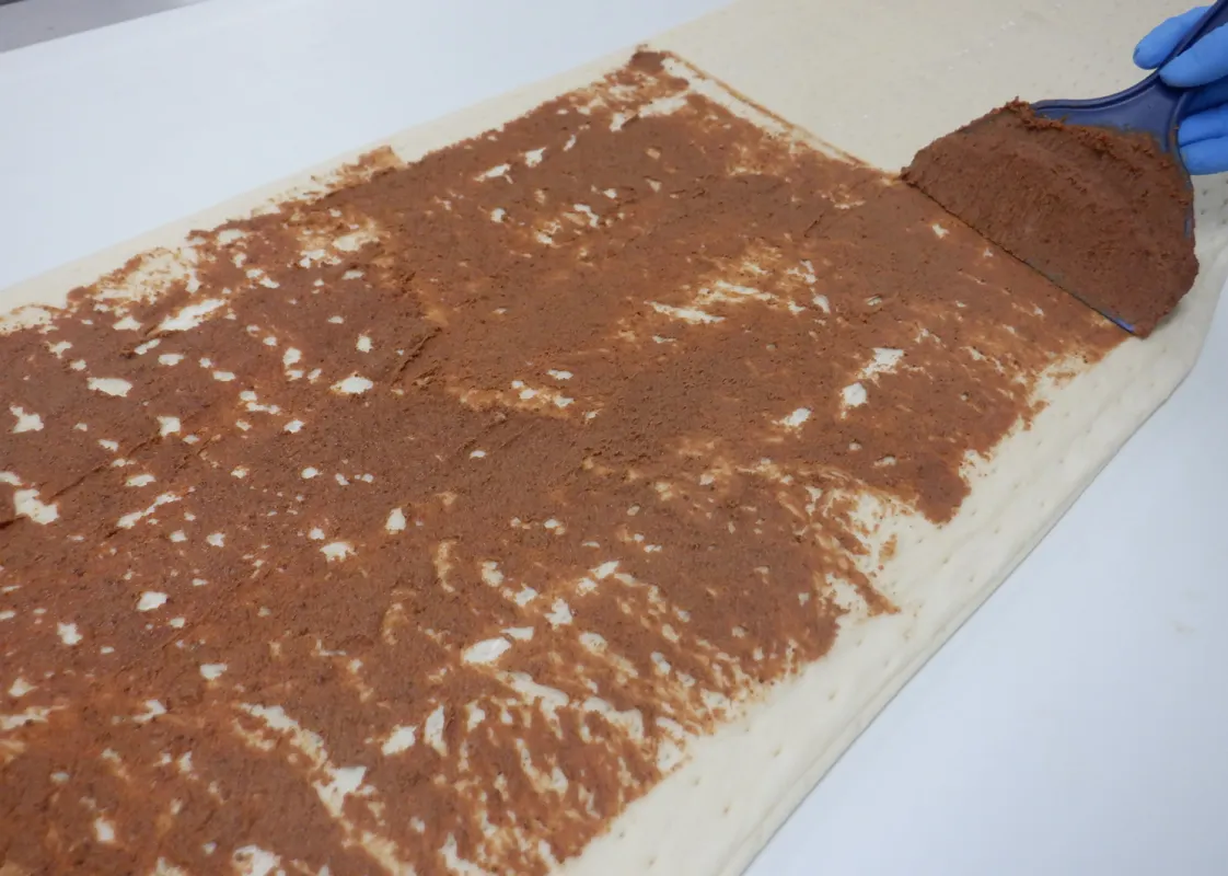 まず大きく伸ばされた巨大な生地に、シナモンフィリングを薄く塗り広げていきます。