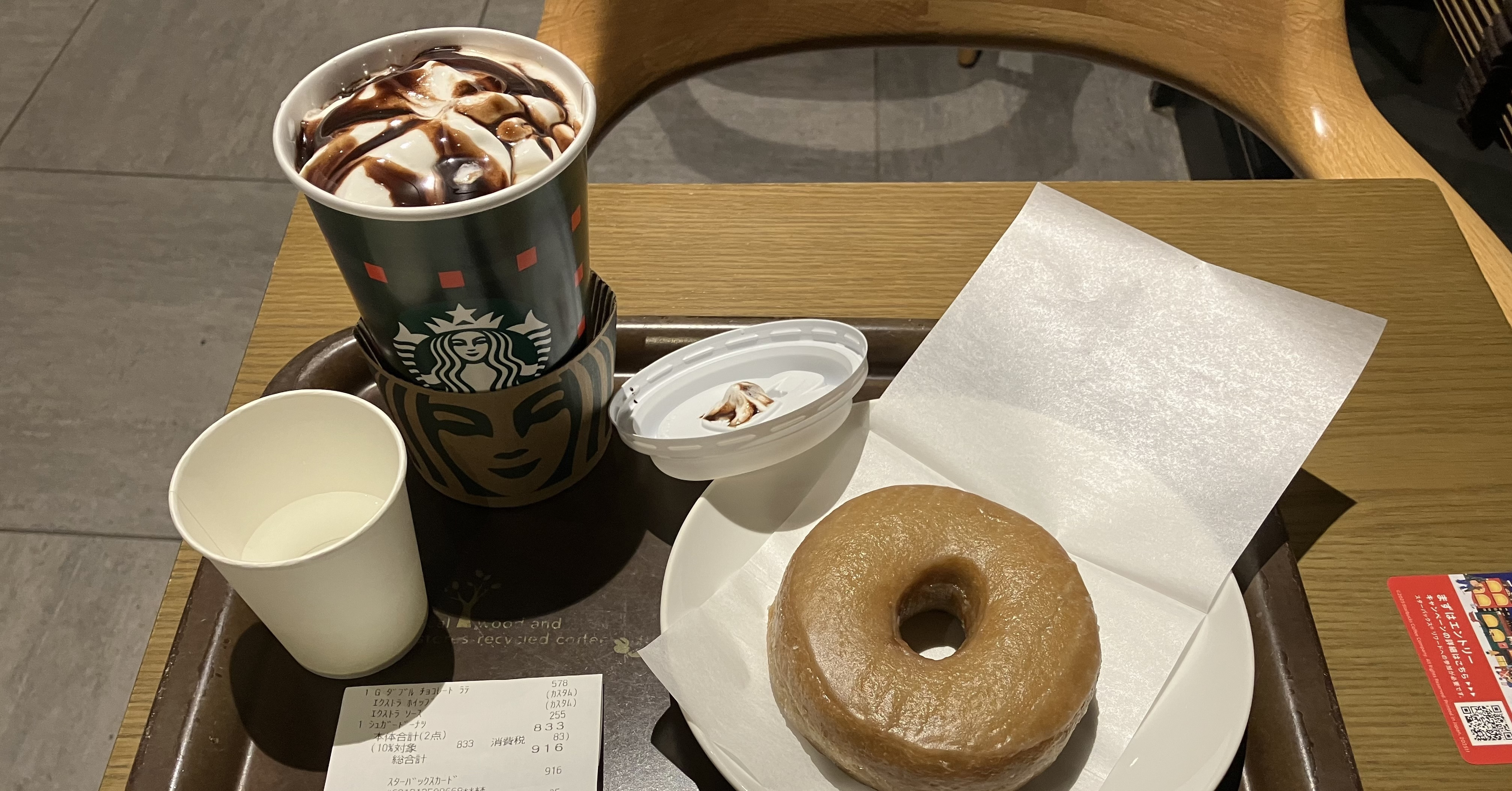 ス○バ幻のドリンク、ダブルチョコレートラテとシュガードーナツをいただきました。