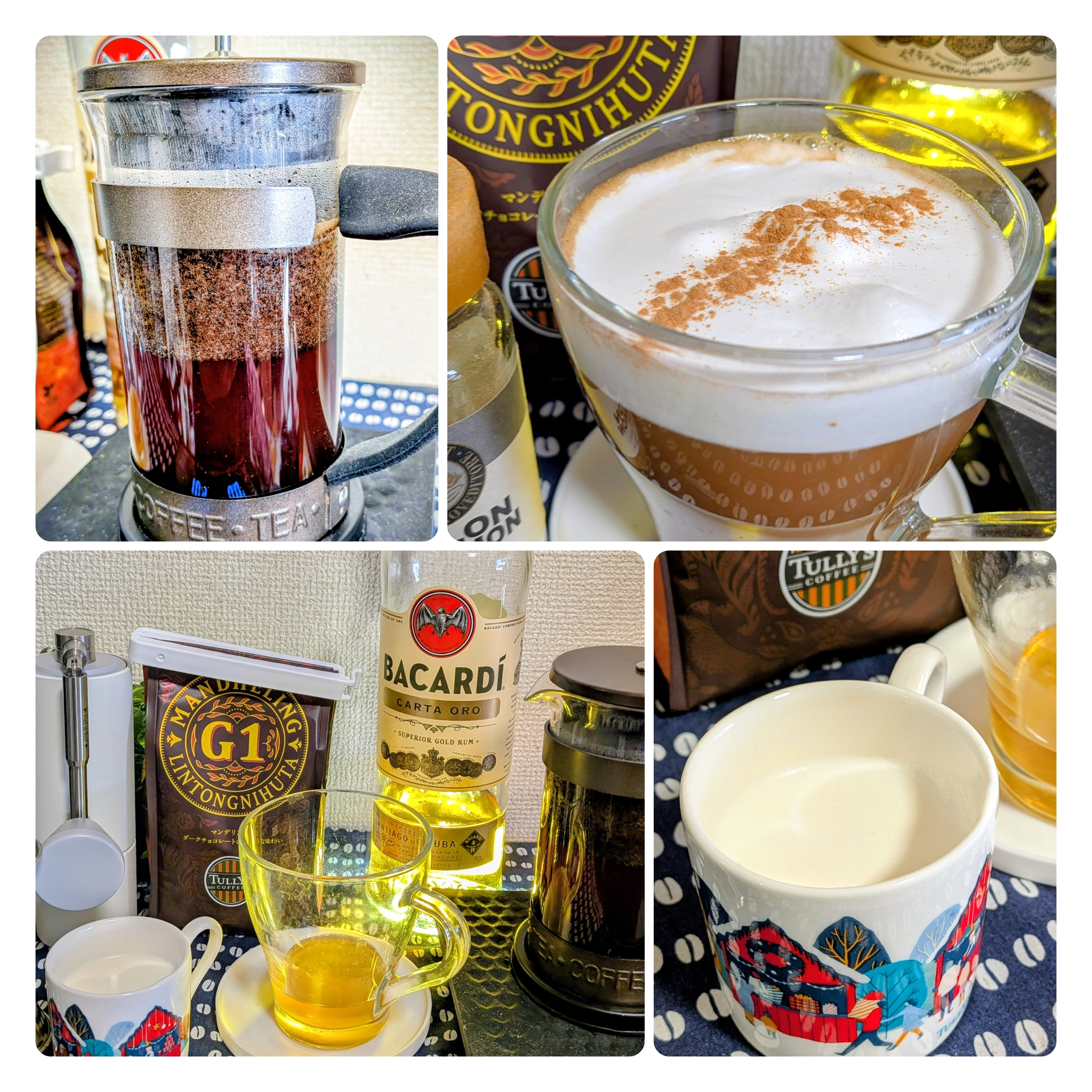 マンデリンG1をプレスで淹れて、ラム酒とタリーズハニー、生クリームでホットカクテルを作りました。ラム酒と深煎りのマンデリンの相性抜群で美味しかったです♪😋