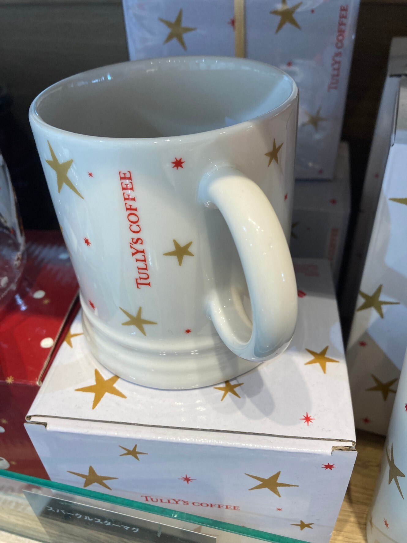 白地にゴールドと赤のキラキラ⭐️タンブラーはよーく見ると星でないものがひとつ隠れてます!マグカップはどうなのかしら?