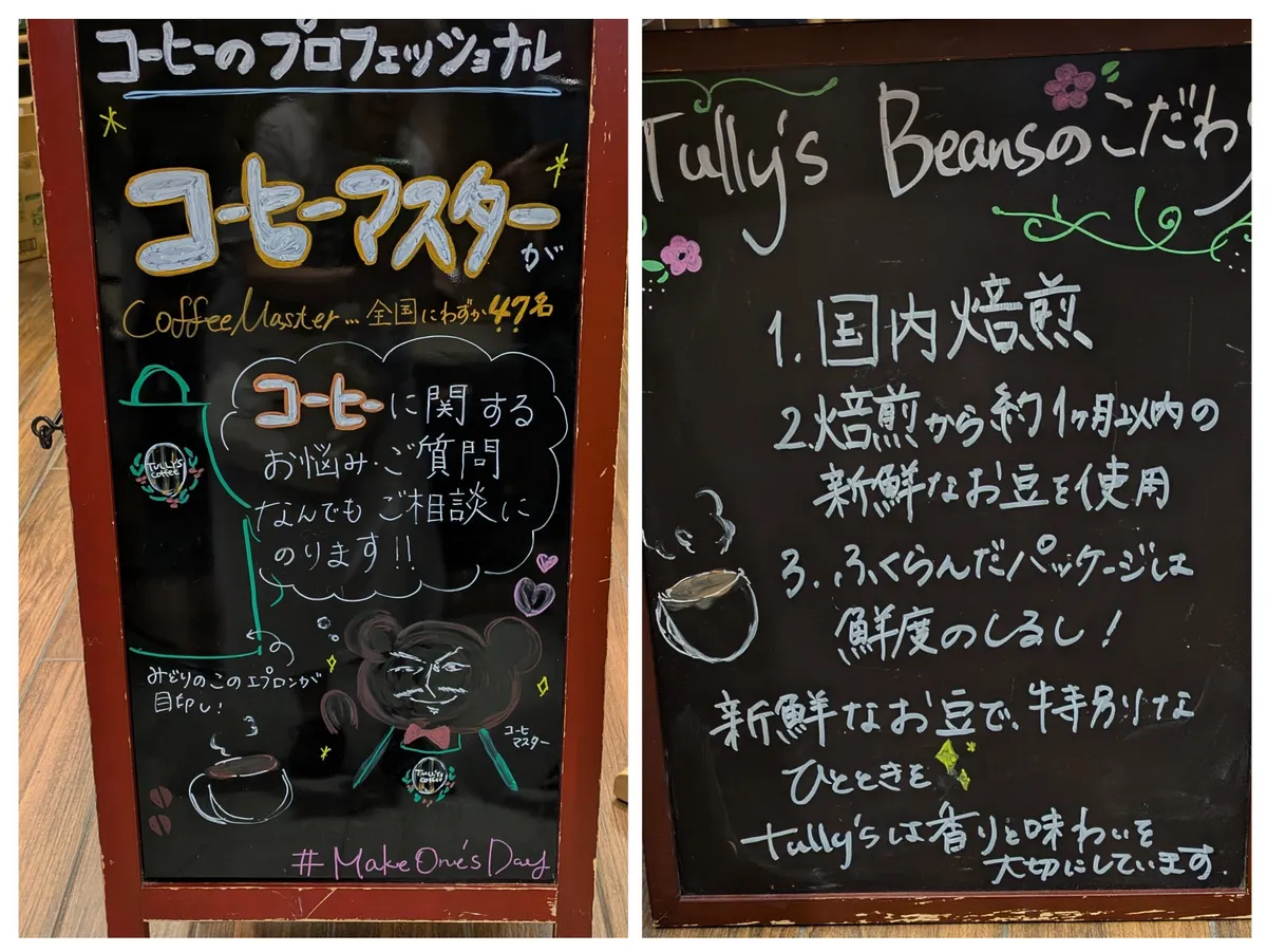 良い雰囲気のポップ、黒板アート、素敵な笑顔のマスターさん、金賞🥇受賞のお豆🫘たち、最高👏👏
