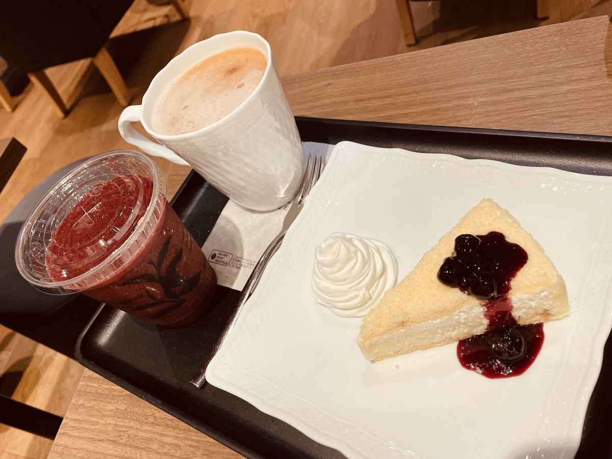 ↑SAKURA香るピーチベリーティー(hot)と、ベリーベリーアールグレイ(スムージー)と、フロマージュのケーキ💕