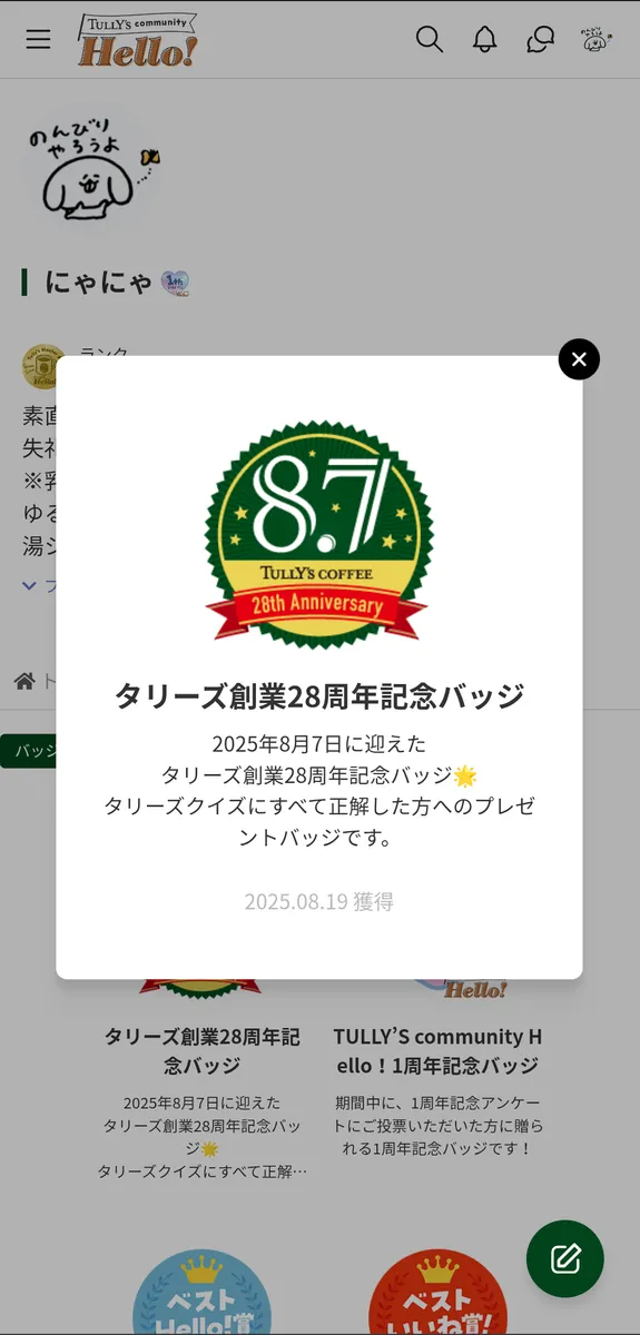 トップ > なんでも写真館 > タリーズ創業28周年記念バッジ獲得! にゃにゃ 2025/08/19 17:30 タリーズ創業28周年記念バッジ獲得! タリーズ創業28周年 おめでとうございます! 先日TakeFive(5分の休憩) のクイズに答え、 全問正解いたしました。 https://community.tullys.co.jp/announcements/rsm7n8qgact3pbtr 本日、クイズ全問正解者ということで バッジがもらえました! 新しいバッジが増え、嬉しいです! タリーズ創業28周年 バッジ 記念バッジ いいね 共有する 共有する X facebook LINE リンクをコピー コメントする 2 件の返信 (新着順) ミュートしたユーザーの投稿です。 投稿を表示 penguinlovescoffee 2025/08/19 19:19 うれしいですよね♫ 装着しました、おそろいですね😊 いいね 返信する ミュートしたユーザーの投稿です。 投稿を表示 にゃにゃ 2025/08/20 13:38 penguinlovescoffee わぁ! お揃いでバッジ装着できて わたしも嬉しいです! クイズ、最後の1問が難しくて ヒントを、探しに行きました。 いいね 返信する ミュートしたユーザーの投稿です。 投稿を表示 matusko 2025/08/19 18:57 おめでとうございます㊗️🎉🎊✨ さすがですね‼ 私は1問目を間違えたらもう次に進めず終了になってしまい悔しかったです〜😫 いいね 返信する ミュートしたユーザーの投稿です。 投稿を表示 にゃにゃ 2025/08/20 13:36 matusko ありがとうございます! クイズ、間違えると先へ進めなくなるのですか? 何度も挑戦させてくれたら、嬉しいですよね! 意外とタリーズさん、手厳しいのでしょうか? ログアウトして入り直したら やり直せたりできないのかしら? タリーズさんへ、改善のメッセージを送ってみると 良いかも知れませんね。 いいね 返信する ミュートしたユーザーの投稿です。 投稿を表示 matusko 2025/08/21 06:29 にゃにゃ クイスの答えと問題が全問載ってましたが、もし続けても全て外れだったと思います。 タリーズの事ほとんど知らないので私には難しかったです😞 いいね 返信する ミュートしたユーザーの投稿です。 投稿を表示 にゃにゃ 2025/08/21 13:03 matusko タリーズのマスコットキャラだけは詳しいですが 2問目は少し怪しかったです。 ヒントを書いてくださっていたので 過去の投稿を遡って探しに行きましたよ。 3問目は、ヒントなしには当たらなかったです。 いいね 返信する ミュートしたユーザーの投稿です。 投稿を表示 matusko 2025/08/21 14:59 にゃにゃ 第2弾があったら今度は慎重に取り組んでやろうと思います💪 いいね 返信する