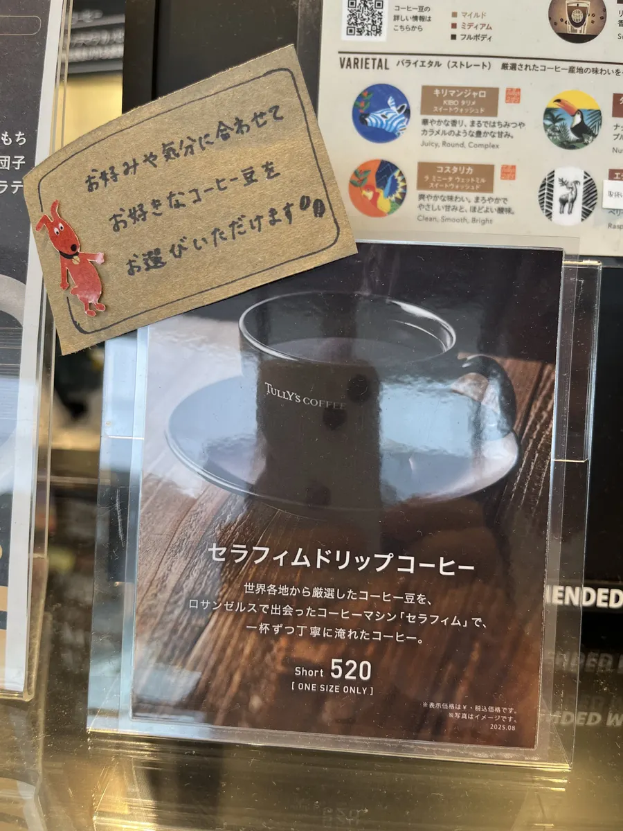 タリーズでパッケージ販売されているビーンズ全部だったような……チャート表に書かれた好きなビーンズを選んで1杯毎に挽いて抽出してくれます