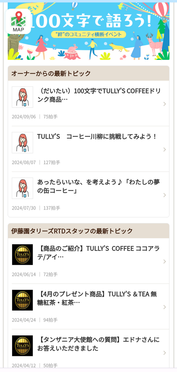 トップ > なんでも写真館 > TULLY'Sコミュニティ発見! にゃにゃ 2024/09/25 23:35 TULLY'Sコミュニティ発見! 本日、たまたま こんなTULLY'Sのコミュニティを発見したのですが ご存じの方いらっしゃいますか? また、登録されている方 いらっしゃったら どんな感じなのか教えてくださいませ コミュニティ TULLY'S TULLY'Sラバーズ TULLY'S好き いいね 共有する 共有する X facebook LINE リンクをコピー コメントする 1 件の返信 (新着順) ミュートしたユーザーの投稿です。 投稿を表示 amored1sk 2024/09/26 06:27 にゃにゃ 興味本位で登録してみました✌ さらさらっと拝見したところ、こちらのコミュニティとは違った様子でしたよ、日々の諸々を書き込んでいて、タリーズに関するお話はされていらっしゃらないようでした...🤔 いいね 返信する ミュートしたユーザーの投稿です。 投稿を表示 フェローみほ 2024/09/26 07:40 amored1sk にゃにゃ LINEのオプチャにもいくつかトークルームありますが…何とも肌に合わず、早々に退散いたしました 私はココが一番です😊 いいね 返信する ミュートしたユーザーの投稿です。 投稿を表示 amored1sk 2024/09/26 08:22 フェローみほ こちらのコミュニティは、本当に居心地が宜しいですよね(^_-)-☆ ワタクシ、他のSNSはインスタグラムくらいなもので、LINE,FB,X,Threads,Pinterest,TikTok・・・全て休眠状態です(^^ゞ いいね 返信する ミュートしたユーザーの投稿です。 投稿を表示 にゃにゃ 2024/09/26 17:27 フェローみほ LINEのオプチャも TULLY'Sあるのですか! オプチャは無法地帯でカオスなイメージです 荒らしもいたり。 スノーボードのオプチャにいくつか入っていましたが マウントの取り合いや口論などされる方がいて 居心地が悪くて抜けてしまいました。 ほんとうに ハロタリはみなさんTULLY'S大好きで 同じ推し活で和氣あいあい 居心地が良いです! フェローみほさんの 数々のフォローのお陰もありますよ! いつもありがとうございます! いいね 返信する ミュートしたユーザーの投稿です。 投稿を表示 にゃにゃ 2024/09/26 17:32 amored1sk わたしも昨夜登録してみたのですが 使い方が全くわからず 企業の公式コミュニティがある と言うことはわかりました TULLY'Sではなく TULLY'S缶コーヒーを出している 伊藤園のTULLY'Sコミュニティのようですね! ポイントを貯めると TULLY'S缶コーヒーがもえる抽選に 応募できるようですね! それにしても 有名どこのろsnsは ほぼ網羅されていて驚きました! いいね 返信する