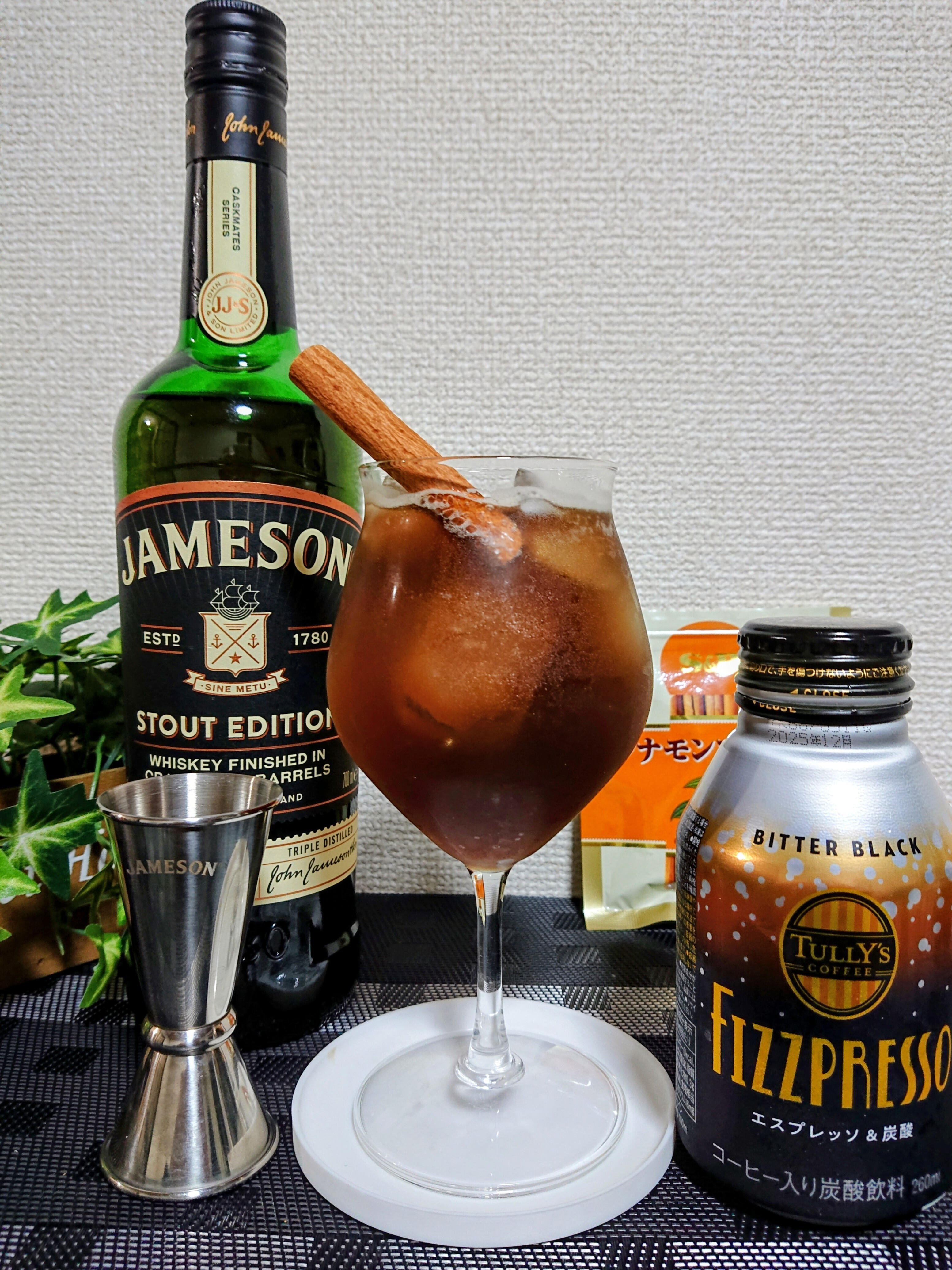 シナモンスティック、ガムシロップ(甘味は必須だと感じてました)、そしてアイリッシュウイスキーですか😉