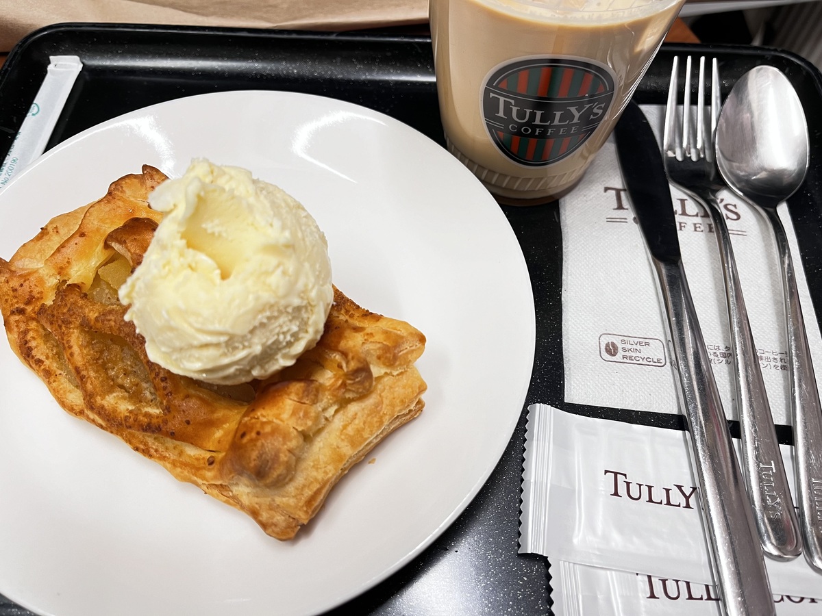 初めて奢ってもらってわくわくしちゃいました。アップルパイのバニラのせとチャイミルクティーのはちみつ追加。