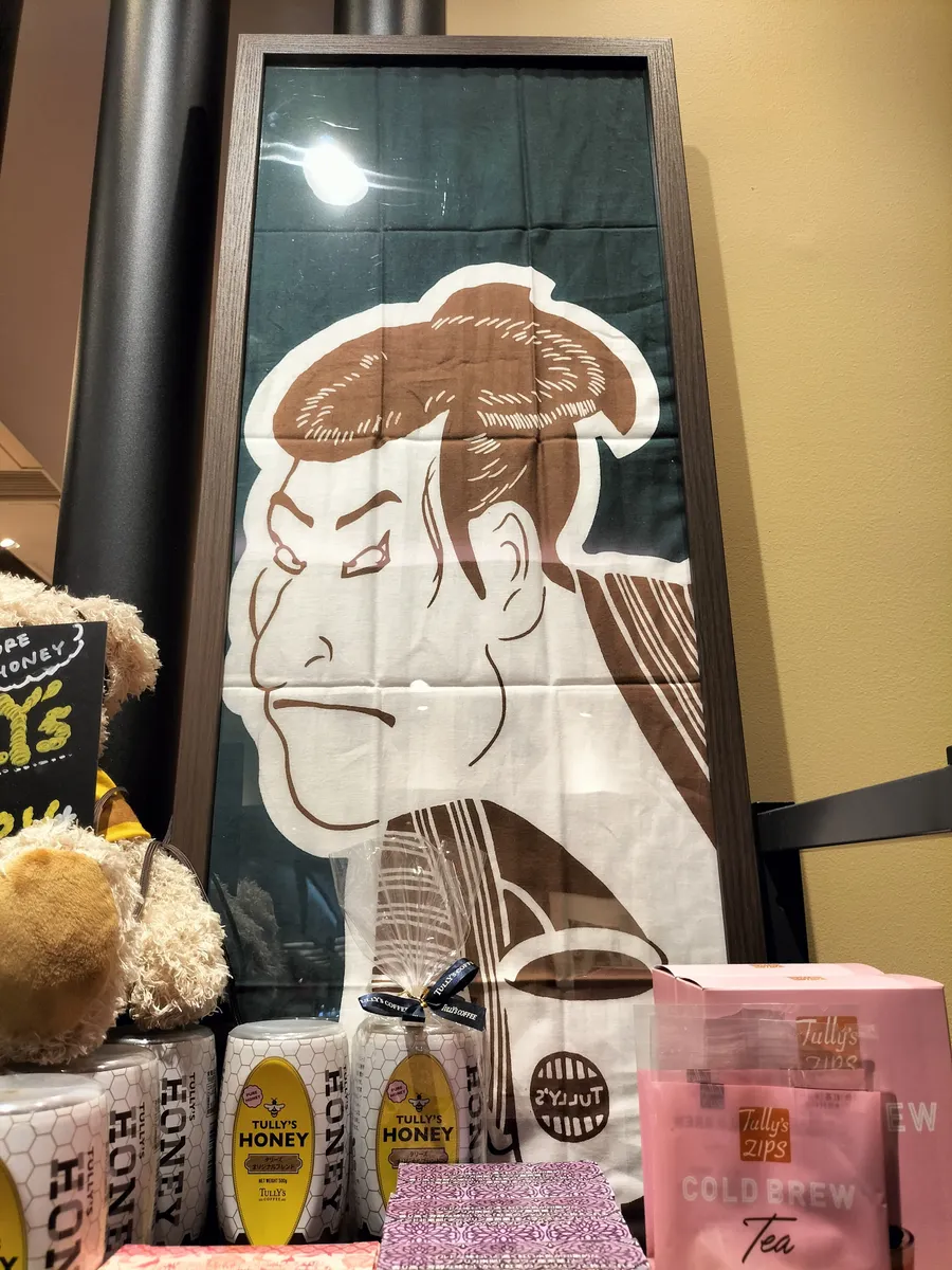 写楽の役者絵に寄せて、タリーズカップが添えられているなんて🧐✨ こんな粋な手ぬぐいが店補限定・数量限定なんて……😍