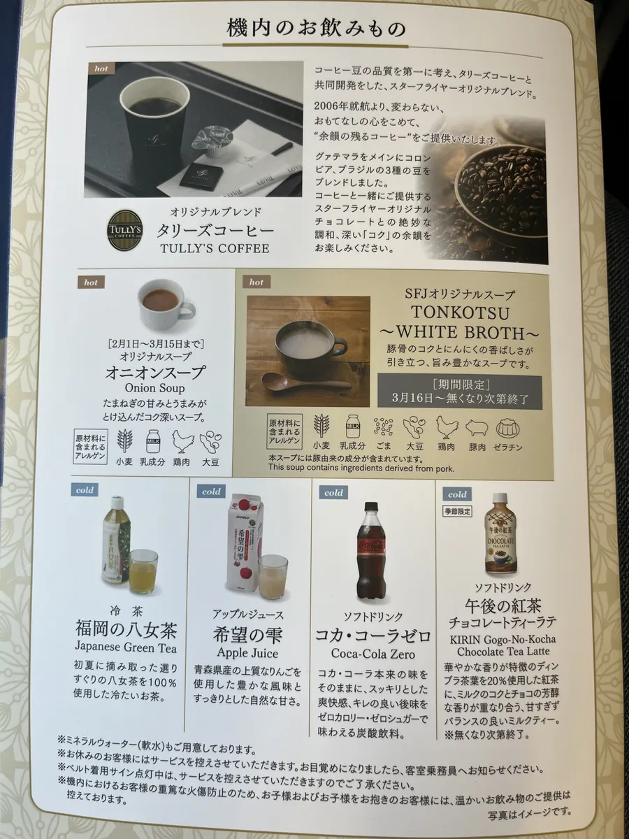 搭乗するスターフライヤーでは機内サービスでオリジナルブレンドのホットタリーズコーヒーが提供されています
