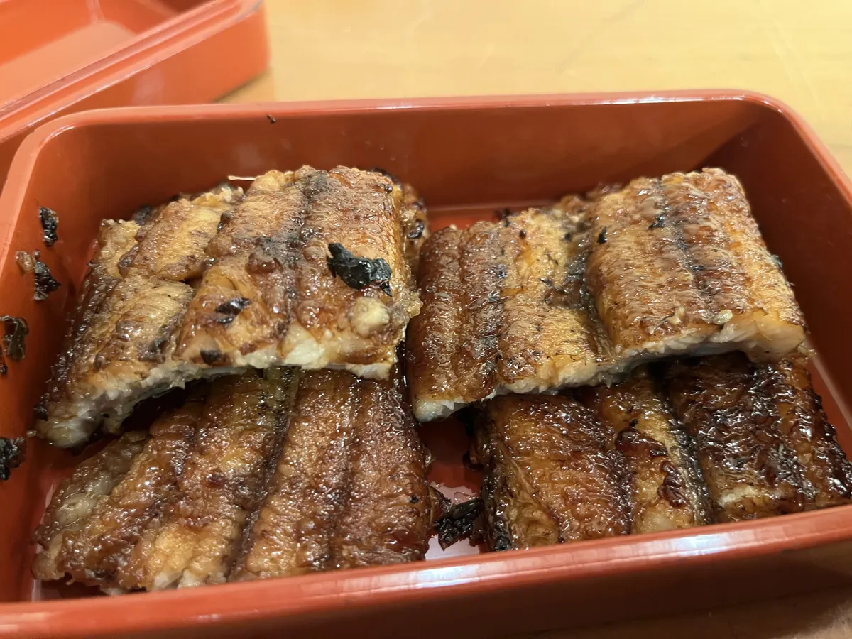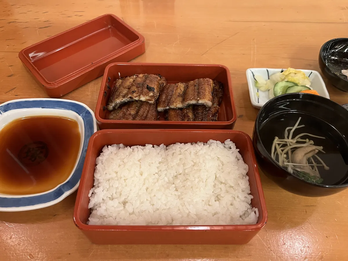 パリッと焼かれたうなぎと白飯が別々にお重に入ってきて、別皿に入れられたタレを付けて食べる鰻重です