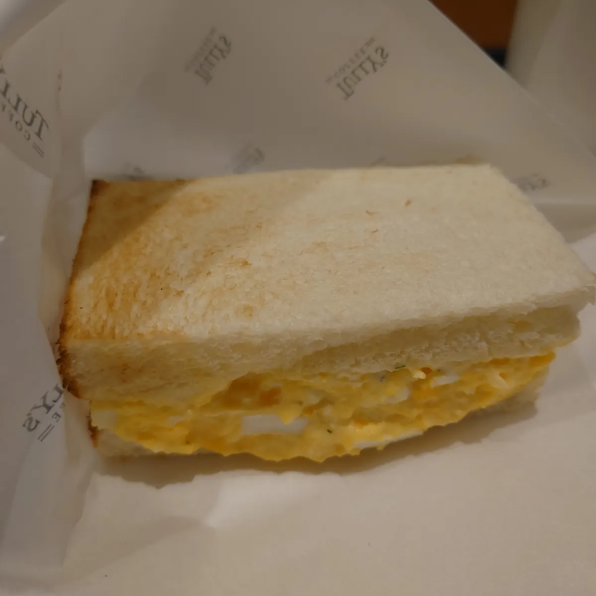 10/18のサタプラをみてから気になっていた、たっぷりタマゴサンドの温めたバージョン&本日のコーヒーコールドミルク入り。