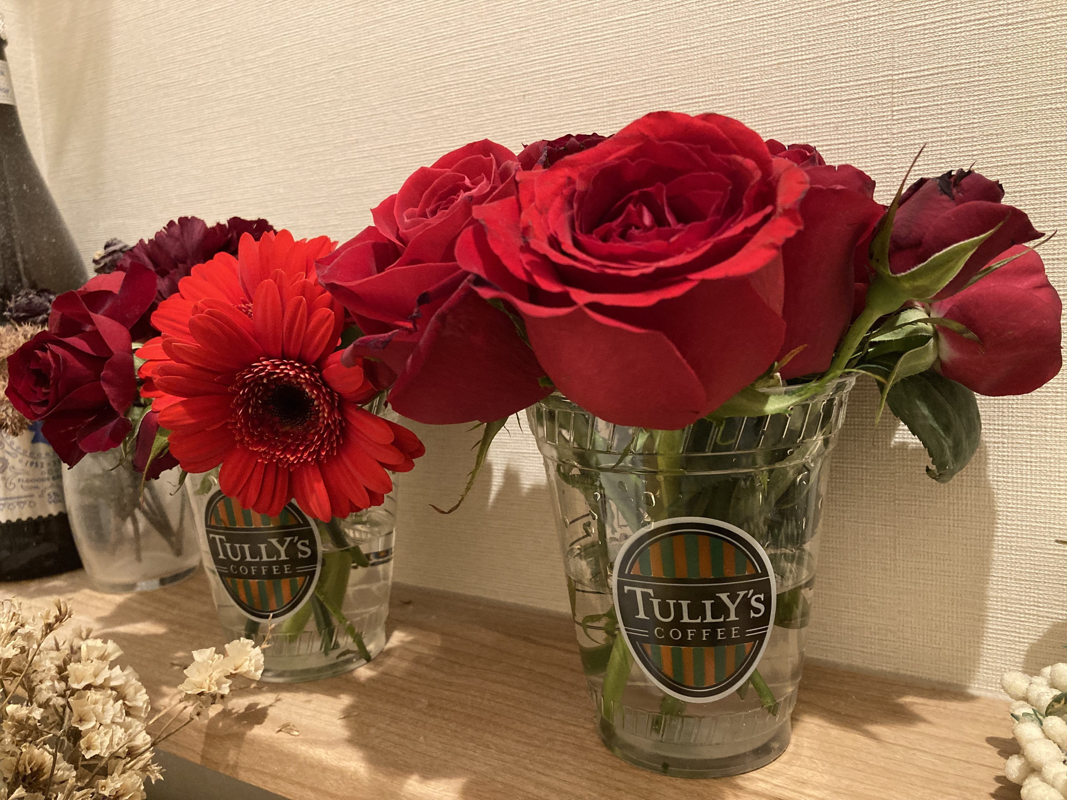タリーズカップがクリアだし 薔薇🌹もいい感じに活けておられて素敵😍✨